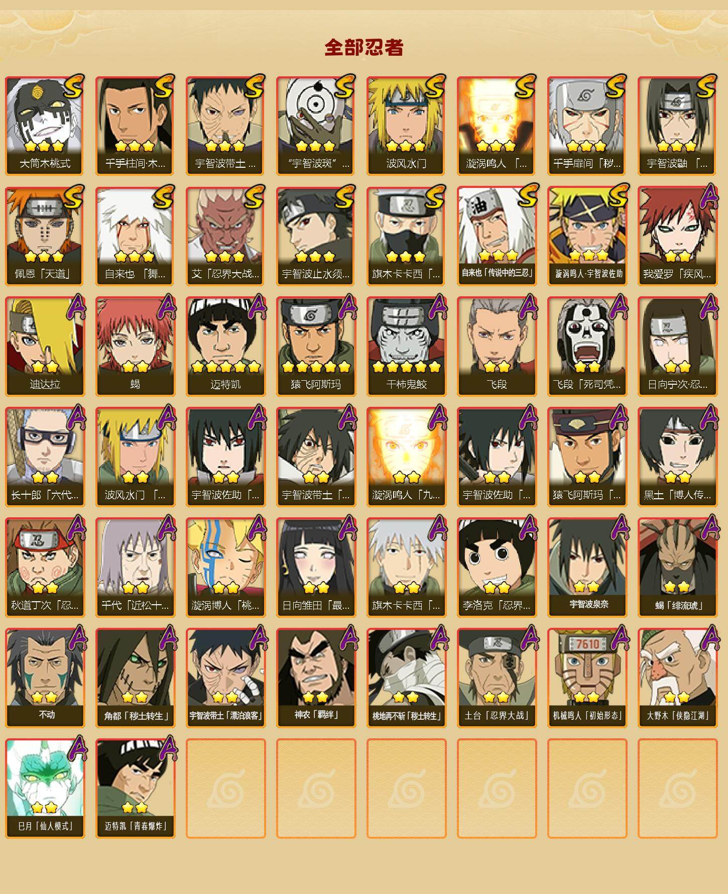 【S级忍者】:千手扉间「秽土转生」(3星),宇智波带土「忍界大战」(3星),艾「忍界大战」(3星),宇智波鼬「须佐能乎」(3星),宇智波止水「须佐能乎」(3星),旗木卡卡西「须佐能乎」(3星),千手柱间「木叶创立」(3星),自来也「舞之豪杰」(3星),自来也「传说中的三忍」(3星),波风水门(3星),漩涡鸣人「九喇嘛连结」(3星),佩恩「天道」(3星),宇智波斑 「白面具」(3星宇智波斑「白面具」),大筒木桃式(3星),漩涡鸣人·宇智波佐助(3星)