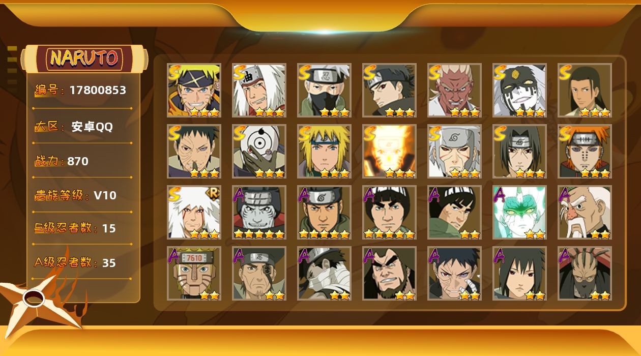 [17800853]15S级忍者数-35A级忍者数 【S级忍者】:千手扉间「秽土转生」(3星),宇智波带土「忍界大战」(3星),艾「忍界大战」(3星),宇智波鼬「须佐能乎」(3星),宇智波止水「须佐能乎」(3星),旗木卡卡西「须佐能乎」(3星),千手柱间「木叶创立」(3星),自来也「舞之豪杰」(3星),自来也「传说中的三忍」(3星),波风水门(3星),漩涡鸣人「九喇嘛连结」(3星),佩恩「天道」(3星),宇智波斑 「白面具」(3星宇智波斑「白面具」),大筒木桃式(3星),漩涡鸣人·宇智波佐助(3星) 【A级忍者】:波风水门「青年」(2星),迪达拉(2星),飞段(2星),飞段「死司凭血」(2星),干柿鬼鲛(5星),漩涡博人「桃式显现」(2星),漩涡鸣人「九尾查克拉」(2星),机械鸣人「初始形态」(2星),迈特凯(5星),旗木卡卡西「幻之真容」(2星),桃地再不斩「秽土转生」(2星),我爱罗「疾风传」(2星),蝎(2星),蝎「绯流琥」(2星),角都「秽土转生」(2星),猿飞阿斯玛(5星),猿飞阿斯玛「七夕限定」(2星),宇智波佐助「须佐能乎」(2星),宇智波佐助「万花筒写轮眼」(2星),日向宁次「忍界大战」(2星),日向雏田「最终章」(2星),宇智波带土「暴怒」(2星),宇智波带土「漂泊浪客」(2星),长十郎「六代目水影」(2星),李洛克「忍界大战」(2星),黑土「博人传」(2星),秋道丁次「忍界大战」(2星),千代「近松十人卫」(2星),神农「羁绊」(2星),土台「忍界大战」(2星),宇智波泉奈(2星),不动(2星),大野木「侠隐江湖」(2星),巳月「仙人模式」(2星),迈特凯「青春爆炸」(2星)