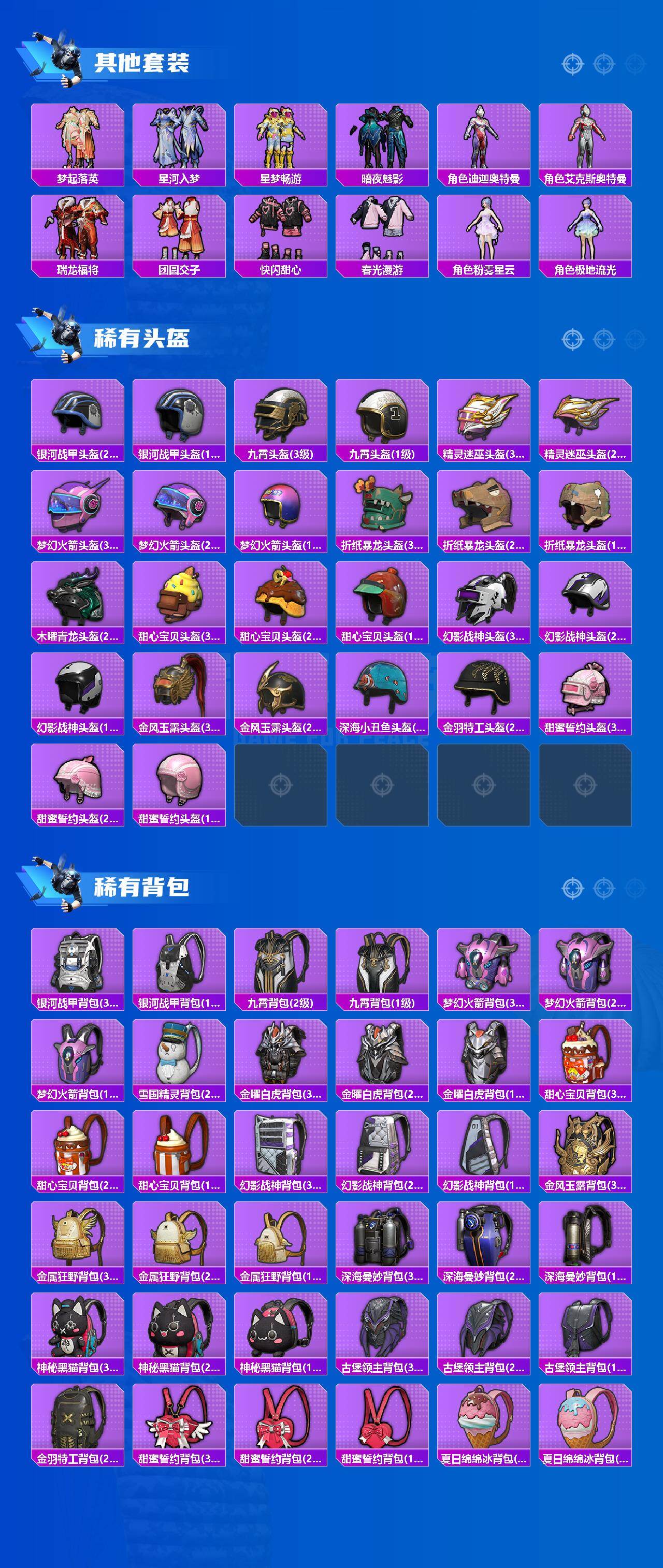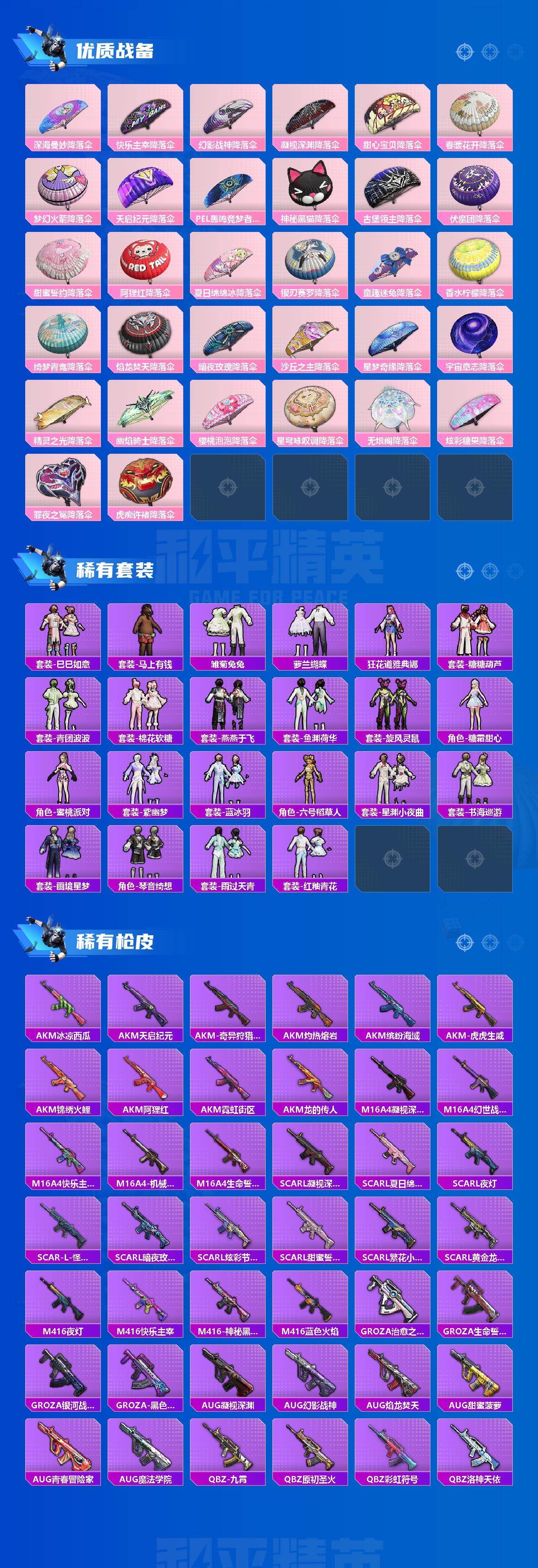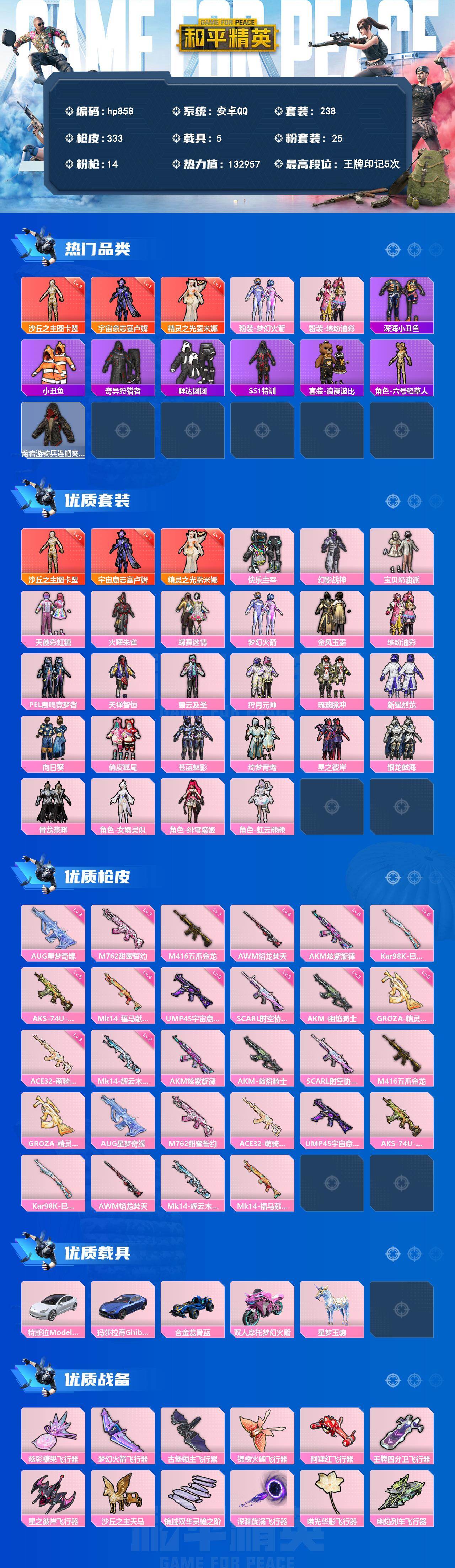 [17801306]安卓 手Q-3神装-25粉装-14特效枪-5载具-12粉色飞行器-132957热力值-5王牌印记-238套装-333枪皮 【红色神装等级】:精灵之光-露米娜(一级),宇宙意志-塞卢姆(一级),沙丘之主-图卡盟(三级) 【红色角色神装】:精灵之光-露米娜,宇宙意志-塞卢姆,沙丘之主-图卡盟 【热门品类】:粉装-梦幻火箭,粉装-缤纷油彩,套装-深海小丑鱼,套装-小丑鱼,套装-奇异狩猎者,套装-胖达团团,套装-SS1特训,套装-浪漫波比,角色-六号稻草人,熔岩游骑兵连帽夹克 【粉色套装】:粉装-快乐主宰,粉装-幻影战神,粉装-宝贝奶油派,粉装-天使彩虹糖,粉装-火曜朱雀,粉装-蝶舞迷情,粉装-梦幻火箭,粉装-金风玉露,粉装-缤纷油彩,粉装-PEL轰鸣竞梦者,粉装-天禅智恒,粉装-彗云及圣,粉装-狩月元帅,粉装-琉璃脉冲,粉装-新星烈龙,粉装-向日葵,粉装-俏皮狐尾,粉装-苍蓝魅影,粉装-绮梦青鸾,粉装-星之彼岸,粉装-银龙傲海,粉装-骨龙祭渊,角色-女娲灵识,角色-绯穹魔姬,角色-虹云熊熊 【粉色枪皮等级】:AKM-炫紫旋律(五级),AKM-幽焰骑士(三级),SCAR-L-时空协奏(三级),M416-五爪金龙(七级),GROZA-精灵之光(三级),AUG-星梦奇缘(八级),M762-甜蜜誓约(七级),ACE32-萌骑漫游(三级),UMP45-宇宙意志(三级),AKS-74U-森灵之息(五级),Kar98K-巳巳如意(五级),AWM-焰龙焚天(六级),Mk14-辉云木星(二级),Mk14-福马献瑞(四级) 【粉色载具】:特斯拉Model 3(珍珠白),玛莎拉蒂Ghibli(蓝),合金龙骨(蓝),双人摩托-梦幻火箭,星梦玉骢 【粉色枪皮】:AKM-炫紫旋律,AKM-幽焰骑士,SCAR-L-时空协奏,M416-五爪金龙,GROZA-精灵之光,AUG-星梦奇缘,M762-甜蜜誓约,ACE32-萌骑漫游,UMP45-宇宙意志,AKS-74U-森灵之息,Kar98K-巳巳如意,AWM-焰龙焚天,Mk14-辉云木星,Mk14-福马献瑞 【粉色飞行器】:炫彩糖果飞行器,梦幻火箭飞行器,古堡领主飞行器,锦绣火鲤飞行器,阿狸红飞行器,王牌四分卫飞行器,星之彼岸飞行器,沙丘之主天马,镜域双华-灵镜之阶,深渊漩涡飞行器,曦光华影飞行器,幽焰列车飞行器 【粉色降落伞】:深海曼妙降落伞,快乐主宰降