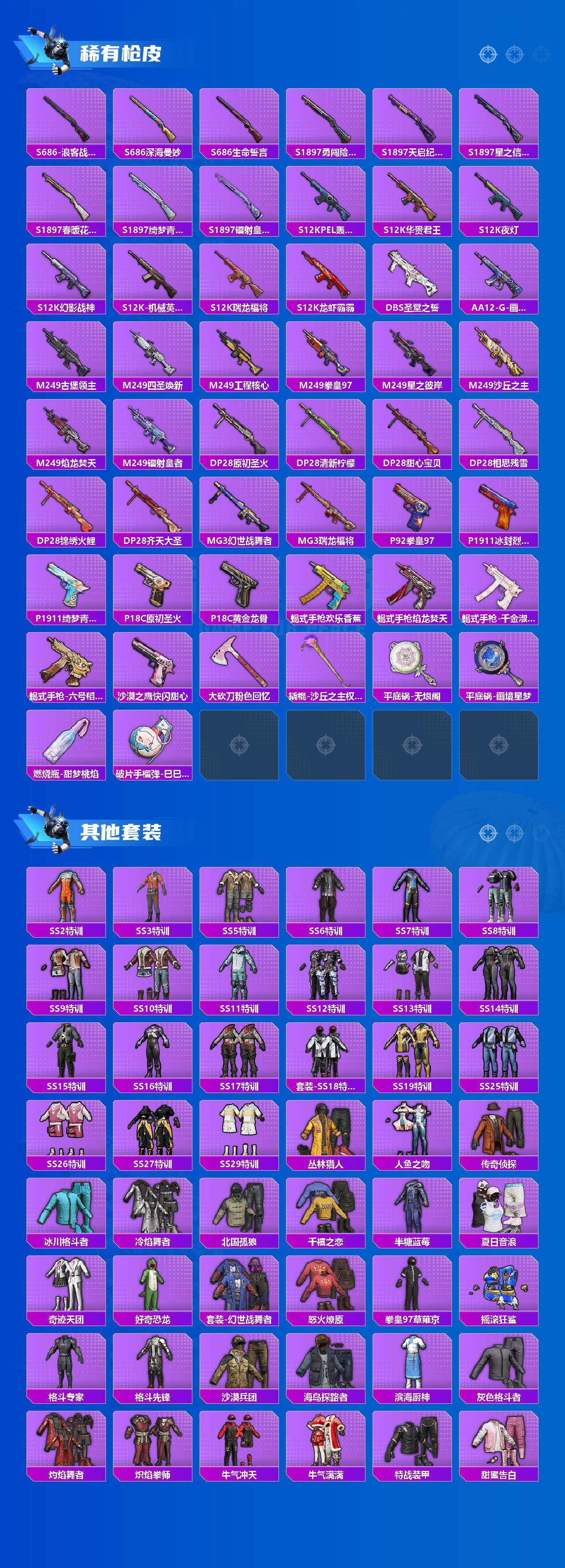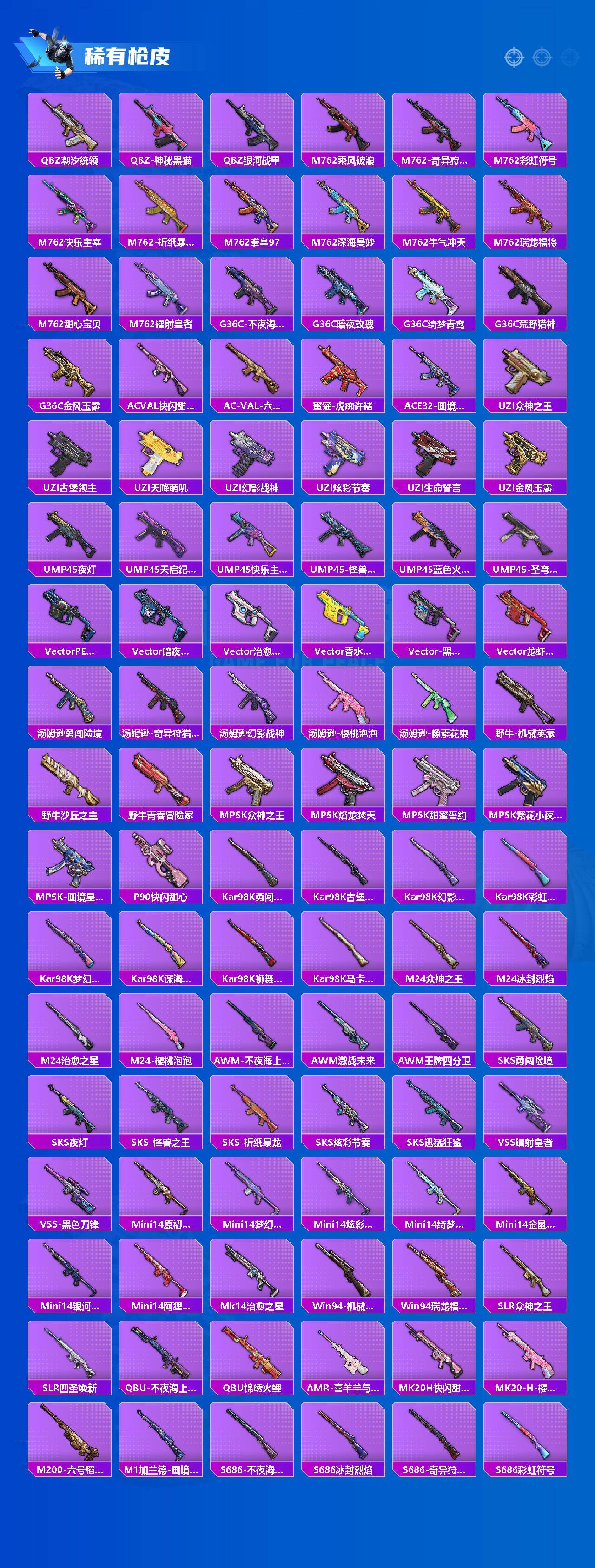 AKM-奇异狩猎者,AKM-缤纷海域,M416-快乐主宰,AUG-魔法学院,M762-奇异狩猎者,M762-瑞龙福将,Kar98K-古堡领主,Kar98K-深海曼妙,AWM-激战未来,S686-奇异狩猎者,M249-古堡领主