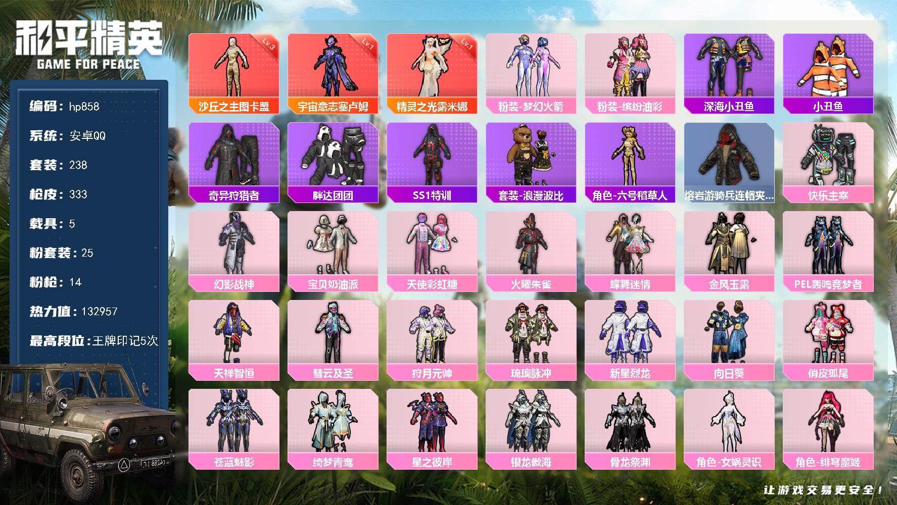 [17801306]安卓 手Q-3神装-25粉装-14特效枪-5载具-12粉色飞行器-132957热力值-5王牌印记-238套装-333枪皮