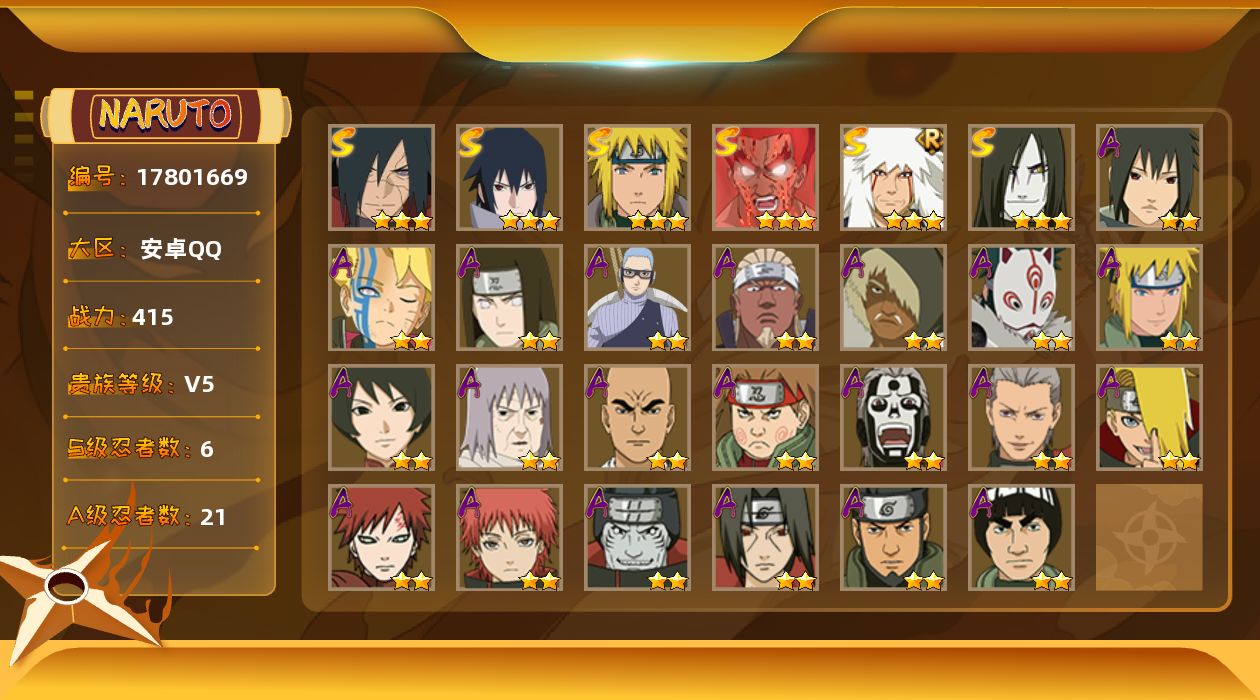 【S级忍者】:宇智波斑「秽土转生·解」(3星),自来也「舞之豪杰」(3星),大蛇丸(3星),波风水门(3星),迈特凯「死门」(3星),宇智波佐助「永恒万花筒」(3星)