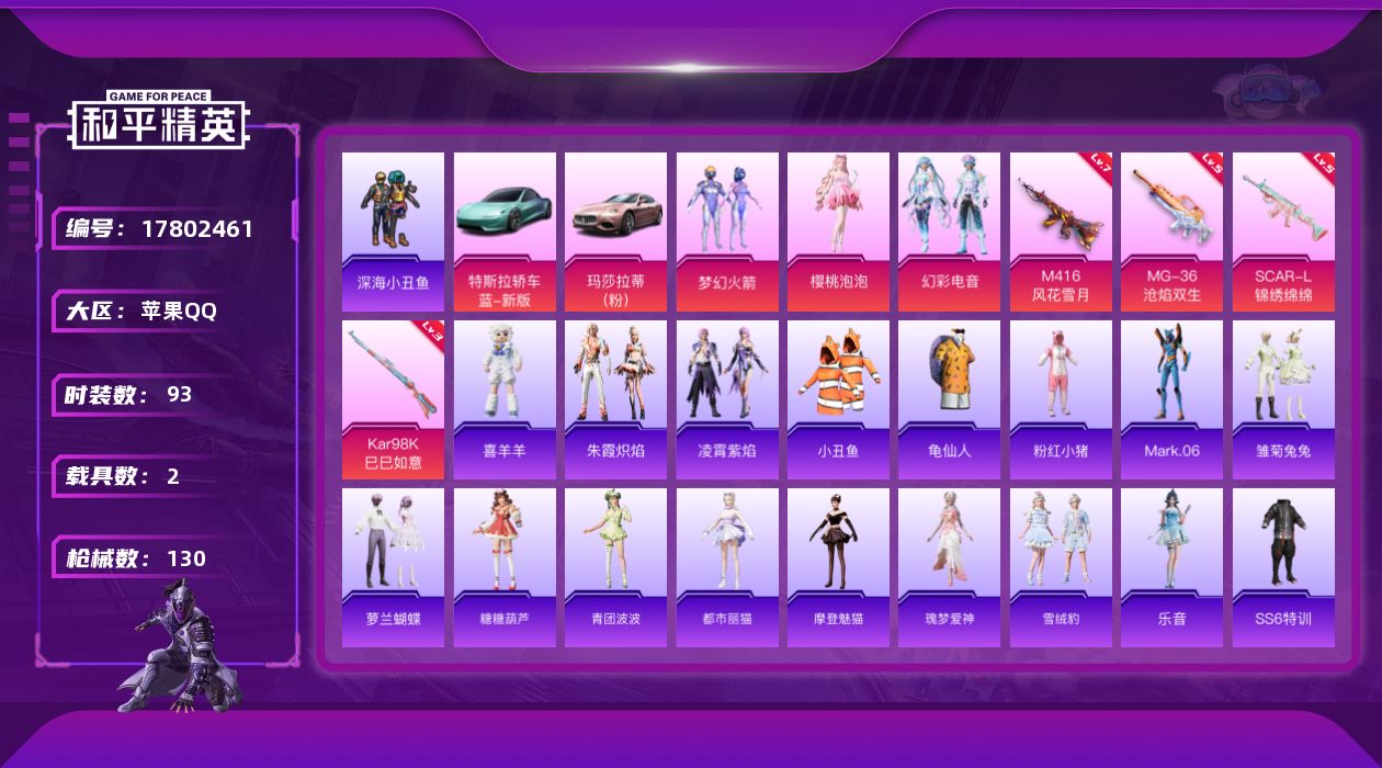 [17802461]苹果 手Q-3粉装-5特效枪-2载具-2粉色飞行器-41836热力值-5王牌印记-93套装-130枪皮