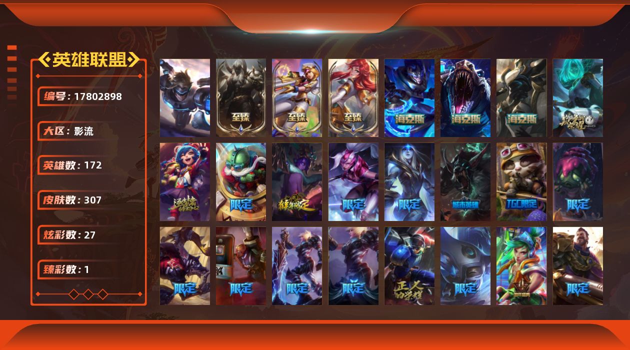 [17802898]【特价出售/店主推荐】铂金段位-172英雄-307皮肤-27炫彩-1终极-8神话-38限定-36传说-90史诗
