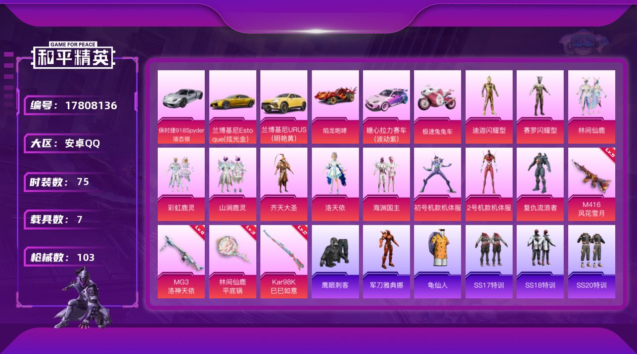 [17808136]【特价出售/店主推荐】安卓 手Q-11粉装-5特效枪-7载具-2粉色飞行器-46966热力值-2王牌印记-75套装-103枪皮【热门品类】:角色-军刀雅典娜,套装-龟仙人【粉色套装】:角色-闪耀迪迦,角色-赛罗闪耀型,粉装-林间仙鹿,粉装-彩虹鹿灵,粉装-山涧鹿灵,粉装-齐天大圣,角色-洛天依,粉装-海渊国主,角色-初号机款机体服,角色-2号机款机体服,角色-复仇流浪者【粉色枪皮等级】:M416-风花雪月(五级),Kar98K-巳巳如意(二级),Mk14-福马献瑞(二级),MG3-洛神天依(四级),平底锅-林间仙鹿(三级)【粉色载具】:兰博基尼Estoque(炫光金),兰博基尼URUS(明艳黄),保时捷918 Spyder(液态银),焰龙咆哮,糖心拉力赛车(波动紫),极速兔兔车,僚机-萌兔起飞【粉色枪皮】:M416-风花雪月,Kar98K-巳巳如意,Mk14-福马献瑞,MG3-洛神天依,平底锅-林间仙鹿【粉色飞行器】:林间仙鹿飞行器,齐天大圣飞行器