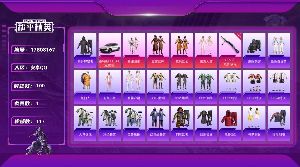 [17808167]安卓 手Q-4粉装-3特效枪-1载具-2粉色飞行器-32993热力值-2王牌印记-100套装-117枪皮