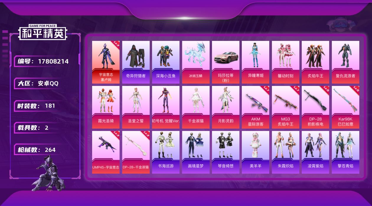 [17808214]可二次【特价出售/店主推荐】安卓 手Q-1神装-10粉装-12特效枪-2载具-5粉色飞行器-83388热力值-11王牌印记-181套装-264枪皮【红色神装等级】:宇宙意志-塞卢姆(三级)【热门品类】:套装-深海小丑鱼,套装-小丑鱼,套装-奇异狩猎者,角色-8号机,角色-Mark.06【粉色套装】:粉装-馨动时刻,粉装-炙焰牛王,角色-复仇流浪者,粉装-霞光圣骑,角色-圣堂之誓,角色-初号机 觉醒Ver.,角色-千金淑猫,角色-月影灵韵,角色-异瞳寒姬,角色-月中灵【粉色枪皮等级】:AKM-星际浪客(七级),ACE32-萌骑漫游(五级),UMP45-宇宙意志(三级),UMP45-萌骑冒险(一级),AKS-74U-森灵之息(五级),Kar98K-巳巳如意(五级),Mk14-福马献瑞(五级),AA12-G-萌骑幻想(五级),DP-28-千金淑猫(三级),DP-28-豹影疾电(五级),MG3-炙焰牛王(七级),PKM-萌骑夺宝(三级)【粉色载具】:玛莎拉蒂Ghibli(粉),冰绡玉鳞【粉色枪皮】:AKM-星际浪客,ACE32-萌骑漫游,UMP45-宇宙意志,UMP45-萌骑冒险,AKS-74U-森灵之息,Kar98K-巳巳如意,Mk14-福马献瑞,AA12-G-萌骑幻想,DP-28-千金淑猫,DP-28-豹影疾电,MG3-炙焰牛王,PKM-萌骑夺宝【粉色飞行器】:炫彩糖果飞行器,夏日绵绵冰飞行器,暖熊萌萌飞行器,龙翔九天飞行器,深渊漩涡飞行器