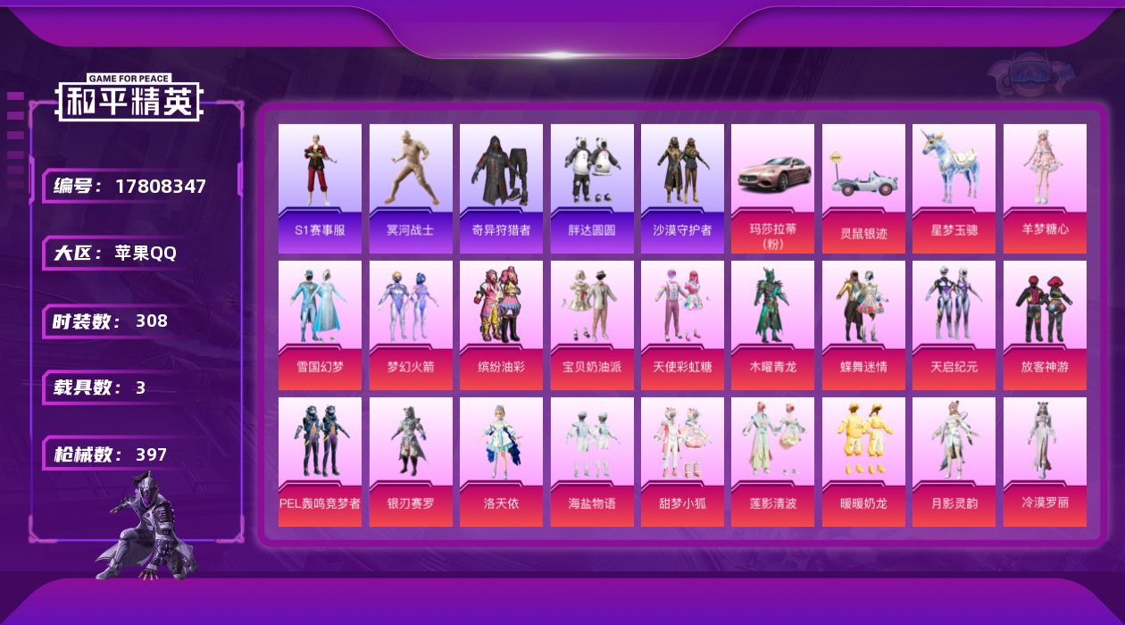 [17808347]【店主推荐捡漏号!可直接换绑】苹果 手Q-无敌战神框-22粉装-12特效枪-3载具-5粉色飞行器-136835热力值-37王牌印记-308套装-397枪皮【热门品类】:粉装-雪国幻梦,粉装-梦幻火箭,粉装-缤纷油彩,绝对防御上衣,套装-S1赛事,套装-浪漫天命,套装-冥河战士,套装-小丑鱼,套装-奇异狩猎者,套装-胖达圆圆,套装-沙漠守护者,套装-龟仙人,套装-潮萌小黄鸭,套装-暗影哥特,套装-浪漫波比,套装-红熊茄茄【粉色套装】:粉装-宝贝奶油派,粉装-天使彩虹糖,粉装-木曜青龙,粉装-雪国幻梦,粉装-蝶舞迷情,粉装-梦幻火箭,粉装-天启纪元,粉装-缤纷油彩,粉装-放客神游,粉装-PEL轰鸣竞梦者,粉装-银刃赛罗,角色-洛天依,粉装-海盐物语,粉装-甜梦小狐,粉装-莲影清波,粉装-暖暖奶龙,角色-月影灵韵,角色-冷漠罗丽,角色-奇迹舞步 雅雅,角色-奇迹舞步 美琪,角色-奇迹舞步 美雪,角色-羊梦糖心【粉色枪皮等级】:AKM-甜心宝贝(七级),AKM-炫紫旋律(一级),SCAR-L-青春物语(七级),M416-五爪金龙(一级),M416-暖熊萌萌(七级),AUG-超新星(七级),M762-甜蜜誓约(七级),UMP45-相思残雪(七级),Kar98K-巳巳如意(五级),Mk14-福马献瑞(一级),AMR-智耀战神(七级),DP-28-豹影疾电(五级)【粉色载具】:玛莎拉蒂Ghibli(粉),灵鼠银迹,星梦玉骢【粉色枪皮】:AKM-甜心宝贝,AKM-炫紫旋律,SCAR-L-青春物语,M416-五爪金龙,M416-暖熊萌萌,AUG-超新星,M762-甜蜜誓约,UMP45-相思残雪,Kar98K-巳巳如意,Mk14-福马献瑞,AMR-智耀战神,DP-28-豹影疾电【粉色飞行器】:炫彩糖果飞行器,炫紫旋律飞行器,PEL轰鸣竞梦者飞行器,星之彼岸飞行器