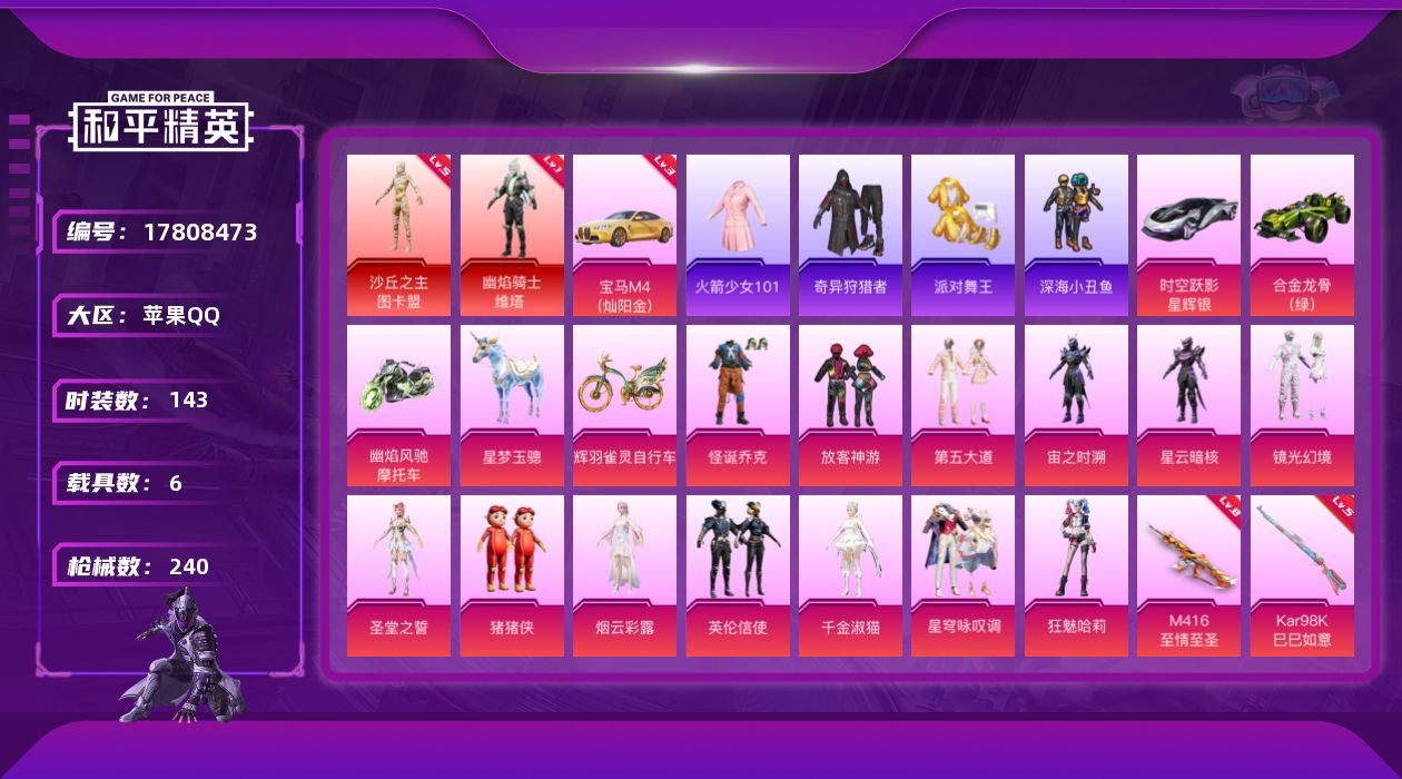 - [15258979]地铁满天赋/苹果 手Q-13粉装-7特效枪-9载具-5粉色飞行器-86352热力值-11王牌印记-188套装-200枪皮【热门品类】:粉装-梦幻火箭,套装-都市猎人,套装-深海小丑鱼,套装-小丑鱼,套装-奇异狩猎者,套装-金羽特工,套装-浪客战士,套装-龟仙人,套装-潮萌小黄鸭,套装-浪漫波比粉色套装】:粉装-深海曼妙,粉装-梦幻火箭,粉装-锦绣火鲤,粉装-翡翠骑士,粉装-星之彼岸,粉装-甜梦冰蝶,粉装-馨动时刻,粉装-炙焰赤龙,粉装-银龙傲海,粉装-吟月归客,粉装-甜心娃娃,粉装-酣梦娃娃,粉装-暗星紫秘粉色枪皮等级】:M416-五爪金龙(五级),AUG-星之彼岸(五级),M762-甜心娃娃(四级),汤姆逊-怪笑疯兔(四级),Kar98K-巳巳如意(三级),VSS-烈焰拳霸(四级),DP-28-豹影疾电(粉色载具】:特斯拉Roadster(水滴蓝),兰博基尼Aventador SVJ(翡翠绿),兰博基尼Estoque(银翼灰),阿斯顿马丁DBS(绿),玛莎拉蒂Ghibli(金),海龙奔腾,萌喵橘座,鬼马风驰,空客H135-蔚蓝之翼,快艇-塞莎KL27(霓虹粉)【粉色枪皮】:M416-五爪金龙,AUG-星之彼岸,M762-甜心娃娃,汤姆逊-怪笑疯兔,Kar98K-巳巳如意,VSS-烈焰拳霸,DP-28-豹影疾粉色飞行器】:梦幻火箭飞行器,潮汐统领飞行器,夏日绵绵冰飞行器,相思残雪飞行器,齐天大圣飞行器