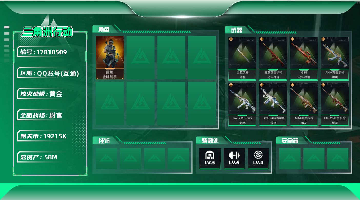 [17810509]58m总资产-19215k哈伏币-57烽火等级-黄金-50战场等级-尉官 【干员外观】:露娜-金牌射手 【近战皮肤】:近战-暗星,近战-黑鹰 【传说外观】:AKM突击步枪-锦绣,SG552突击步枪-运动员,腾龙突击步枪-马年祥瑞,K437突击步枪-锦绣,SMG-45冲锋枪-锦绣,M14射手步枪-蛮荒,M14射手步枪-缄花,SR-25射手步枪-缄花,.357左轮-缄花,G18-马年祥瑞 【史诗外观】:AKM突击步枪-逆战未来,K416突击步枪-冬日风情,K416突击步枪-腊梅,K416突击步枪-阿萨拉特攻,K416突击步枪-缄默情歌,AUG突击步枪-蝮蛇,M7战斗步枪-百步穿杨,G3战斗步枪-流沙送葬,G3战斗步枪-哈夫克警备,AS Val突击步枪-百步穿杨,腾龙突击步枪-猎鳄行动,KC17突击步枪-缄默情歌,Vector冲锋枪-猎鳄行动,Vector冲锋枪-百步穿杨,SR-3M紧凑突击步枪-开工大吉,勇士冲锋枪-丛影谍踪,MP7冲锋枪-六套之力,S12K霰弹枪-曙光,S12K霰弹枪-缄默情歌,PKM通用机枪-阿萨拉特攻,M249轻机枪-丛影谍踪,VSS射手步枪-丛影谍踪,M14射手步枪-工业狂潮, M14射手步枪-航天庆典,M700狙击步枪-百步穿杨,AWM狙击步枪-流沙送葬,沙漠之鹰-曙光 【稀有外观】:M4A1突击步枪-繁盛,ASh-12战斗步枪-繁盛,K416突击步枪-一帆风顺,AUG突击步枪-全金属外壳,M7战斗步枪-前沿科技,M7战斗步枪-精英联盟,SG552突击步枪-2026,SG552突击步枪-马年新春,SG552突击步枪-贴花艺术, AK-12突击步枪-马年新春,SCAR-H战斗步枪-荣耀列队,G3战斗步枪-主宰,CAR-15突击步枪-来财,AS Val突击步枪-哈夫克科技,KC17突击步枪-来财,MP5冲锋枪-弄臣,MP5冲锋枪-哈夫克卫队,P90冲锋枪-医疗协议,P90冲锋枪-贴花艺术,SMG-45-行动开启,SMG-45冲锋枪-幻影结构,SR-3M紧凑突击步枪-马年新春,勇士冲锋枪-主宰,勇士冲锋枪-冰天雪地,M249轻机枪-战损,M249轻机枪-冰天雪地,QJB201轻机枪-哈夫克卫队,Mini-14射手步枪-荣耀列队,Mini-14射手步枪-来财,M14射手步枪-出厂配置,M14射手步枪-精英联盟,SKS射手步枪-弄臣,SR-25射手步枪