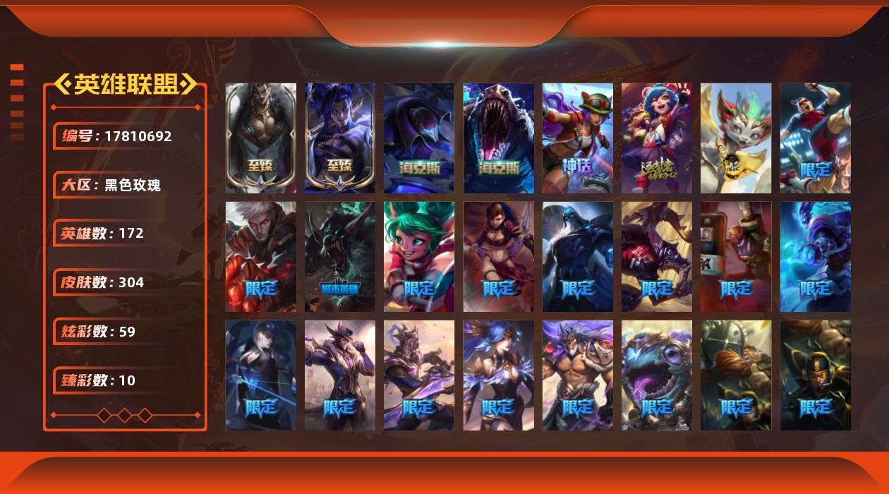 [17810692]【店主推荐捡漏号】白银段位-172英雄-304皮肤-59炫彩-0终极-6神话-48限定-35传说-59史诗