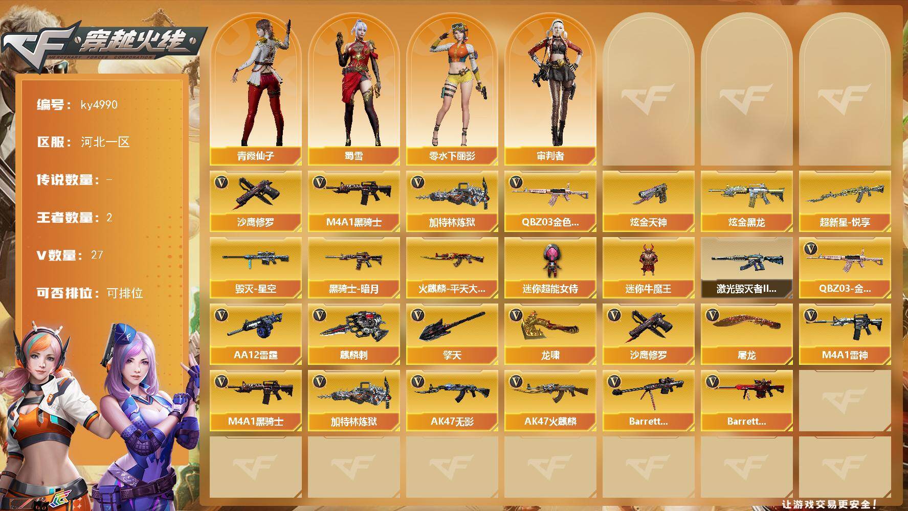 [17637662]【ky4990】河北一区-27V-2王者-2炫金 【热门武器】:QBZ03-金色蔷薇,M4A1-黑骑士,加特林-炼狱,沙鹰-修罗 【王者炫金武器】:炫金天神,炫金黑龙,超新星-悦享 【稀有皮肤】:火麒麟-平天大圣,黑骑士-暗月,毁灭-星空 【角色】:零-水下丽影,审判者,蜀雪,青霞仙子 【人偶武器】:迷你超能女侍,迷你牛魔王 【挑战大师】:激光毁灭者III-白马银枪 【英雄级武器】:QBZ03-金色蔷薇,M4A1-雷神*2,M4A1-黑骑士,加特林-炼狱,AK47-无影*3,AK47-火麒麟,Barrett-毁灭,Barrett-极光,AA-12-雷霆,沙鹰-修罗,麒麟刺*2,擎天,龙啸,屠龙 【特殊枪械】:1黑骑士,1炼狱