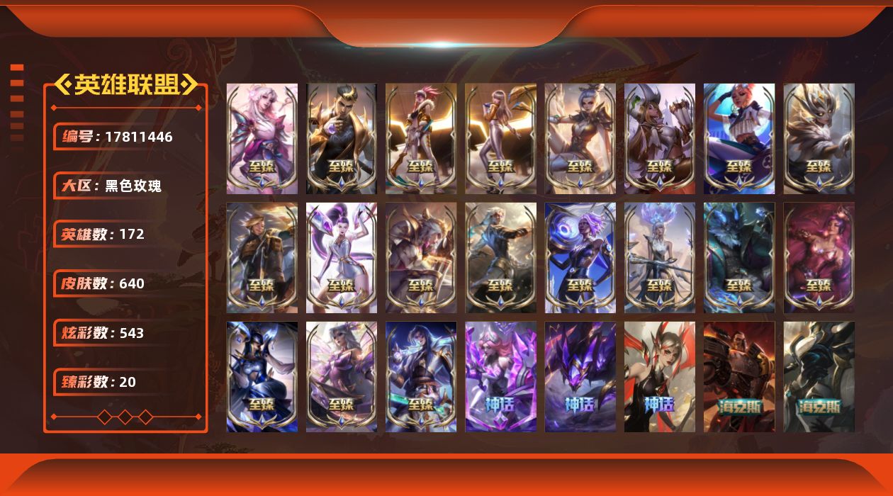 青铜段位-172英雄-640皮肤-543炫彩-0终极-29神话-79限定-71传说-122史诗