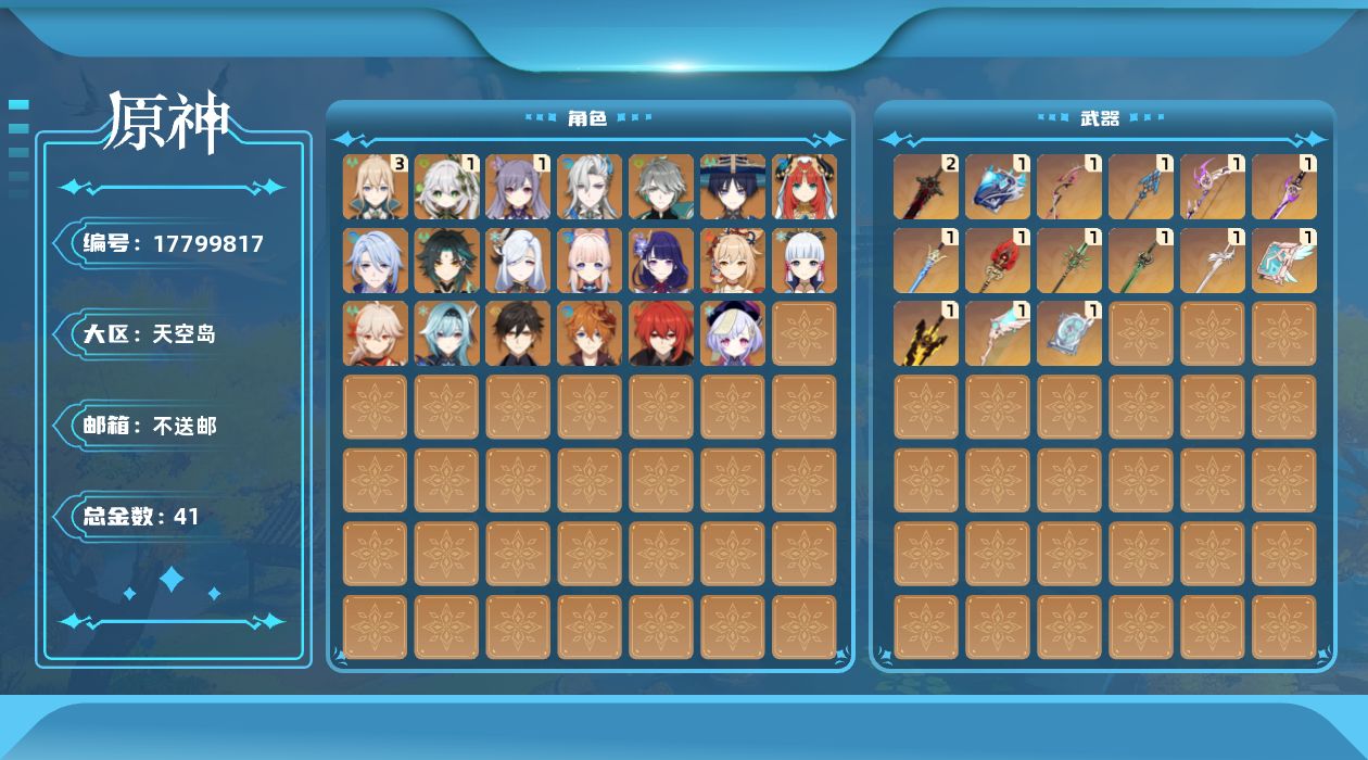 0命那维莱特,0命艾尔海森,0命流浪者,1命纳西妲,0命妮露,0命神里绫人,0命申鹤,0命优菈,0命雷电将军,0命枫原万叶,0命神里绫华,0命钟离,0命魈,0命宵宫,0命达达利亚,0命珊瑚宫心海,1命刻晴,0命七七,3命琴,0命迪卢克,精1万世流涌大典,精1最初的大魔术,精1息灾,精1飞雷之弦振,精1雾切之回光,精1苍古自由之誓,精1无工之剑,精1护摩之杖,精1磐岩结绿,精1四风原典,精1和璞鸢,精1天空之翼,精1天空之卷,精1风鹰剑,精2狼的末路
