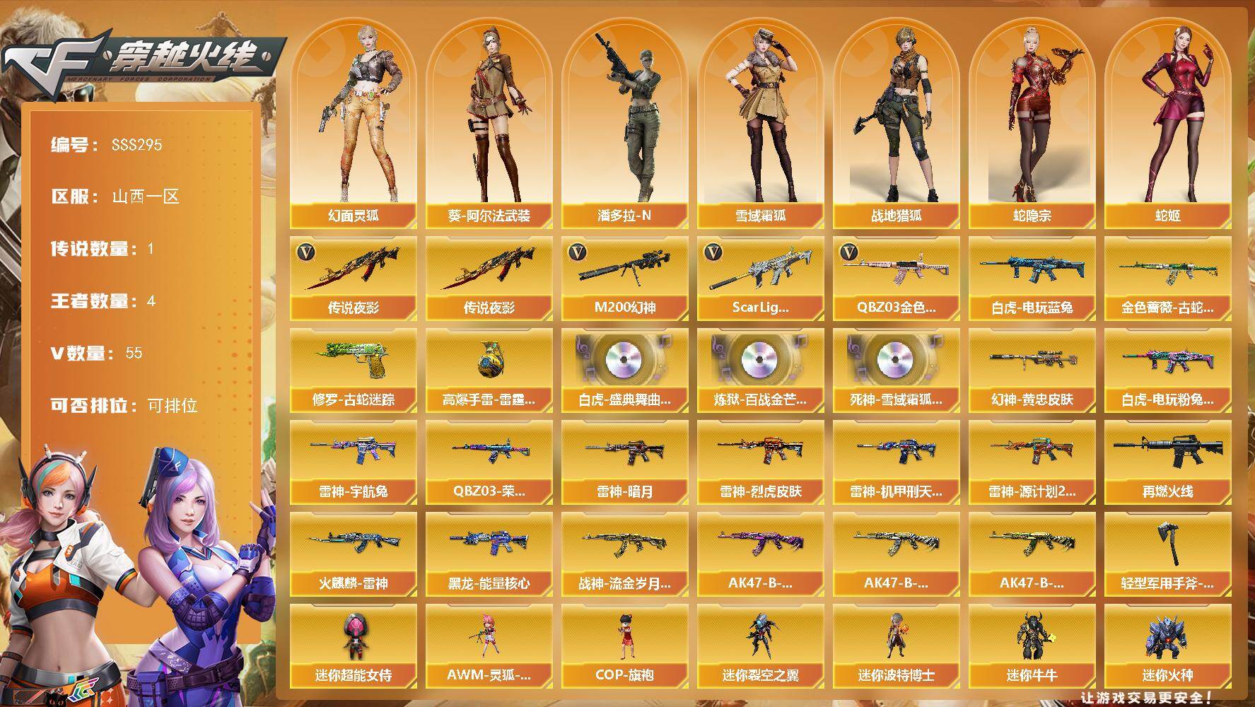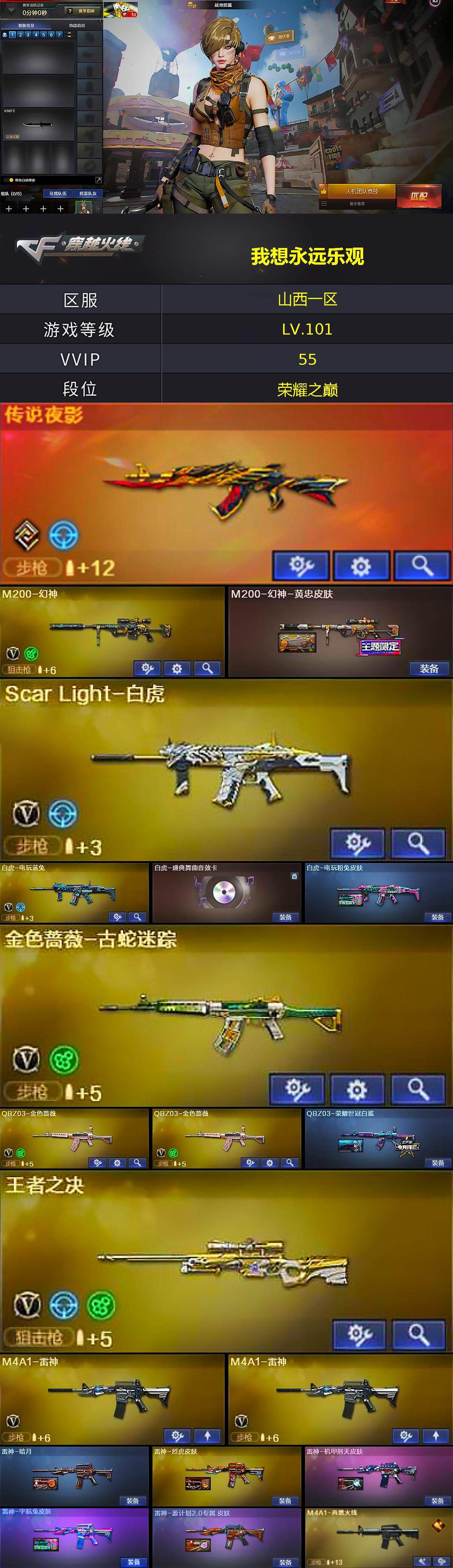 - [15554390]河南一区-82V-25王者-10炫金 【传说武器】:传说光耀,传说圣灵 【热门武器】:传说光耀,传说圣灵,QBZ03-金色蔷薇,Scar Light-白虎,HK417-朱雀,M200-幻神,QBZ-03-王者蔷薇,死亡之眼,金色小号,C.A.T,Cat-刀锋,牛牛-AK47,M4A1-黑骑士*2,汤姆逊-烈龙*6,RPK-盘龙*4,加特林-炼狱*6,斯泰尔-蝴蝶,火麒麟-绝迹,沙鹰-修罗*3,荣耀世冠-龙啸,金刚伞 【王者炫金武器】:王者之戮,王者之幻,王者之翼,王者之武,王者之魄,QBZ-03-王者蔷薇,王者之光,王者之灵,王者之魂*2,王者之锋,炫金黑龙,炫金雷神,炫金武士*2,炫金超新星*2,炫金毁灭,炫金天龙,炫金天神*2 【音效卡】:AK47-火麒麟音效卡,Barrett-毁灭音效卡,Barrett-碧霄极光音效卡,白虎-盛典舞曲音效卡,炼狱-百战金芒-庆典舞曲音效卡,死神-雪域霜狐-怀旧音效卡,Barrett-毁灭-怀旧音效卡 【皮肤】:幻神-荣耀世冠EP 皮肤,幻神-电竞之星 皮肤,白虎-白鲨-CFPLS23冠军,雷神-R.LGD-CFPLS18冠军,M4A1-再燃火线,火麒麟-雷神,毁灭-星空,黑龙-能量核心*2,黑骑士耀金皮肤,无影-能量核心,无影耀金皮肤,天龙-秘银,天龙-能量核心,AWM-天龙-传奇70KG,修罗-能量核心*2,修罗-星空,龙啸-巅峰荣耀 皮肤,轻型军用手斧-再燃火线 【角色】:零,樱,瞳,战地猎狐,王者王力宏,雪域霜狐,奇洋探员,乔伊教练,修道士,云海玲珑,娟娟,零-水下丽影,娜塔莉娅,潘多拉-X,潜龙队-X,新娜塔莎,影武者-X,雅典娜 【人偶武器】:火麒麟-绝迹,火麒麟-灵狐*2,超新星-枪娘安琪儿,斯泰尔-蝴蝶,巴雷特-零-水下丽影,AWM-灵狐-15周年嘉年华,M37-葵,COP-旗袍,C.A.T,Cat-刀锋,M4A1-刀锋,牛牛-AK47,迷你深渊冰龙,迷你生化手雷*2,生化手雷-机甲核心,深渊终结者手雷,M4A1-斯沃特 【暴走生化】:死亡之眼,超级对讲机 【挑战大师】:神圣爆裂者III,激光毁灭者III*5,阐释者III 【英雄级武器】:M4A1-千变,AK47-火麒麟*2,M4A1-黑龙,M4A1-雷神*4,M4A1-黑骑士*2,AK47-无影,M4A1-死神,AK47-黑武士,AN94-超新星,AK47-