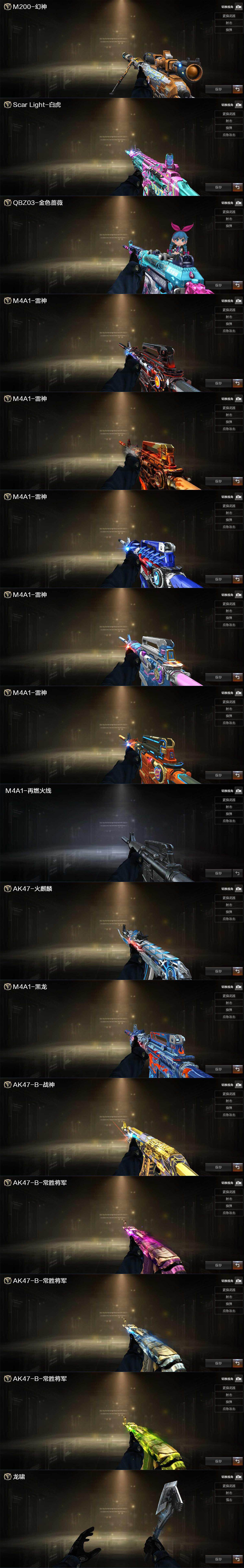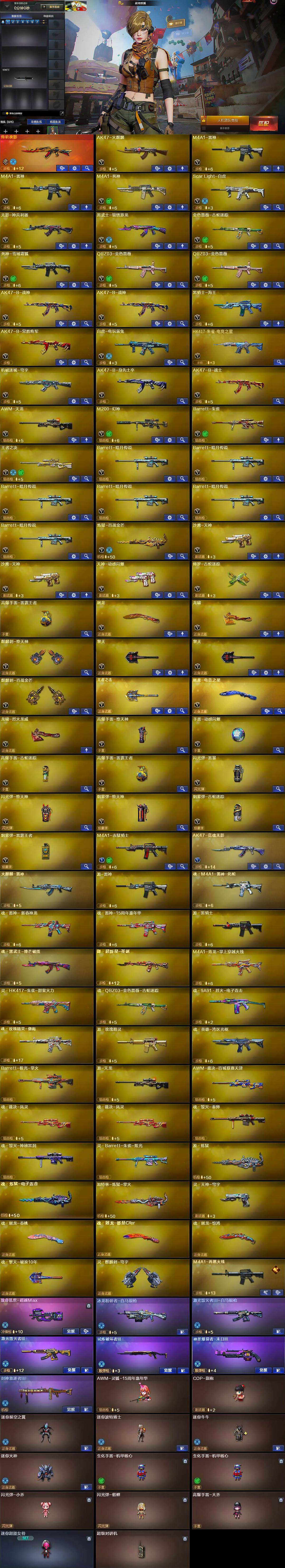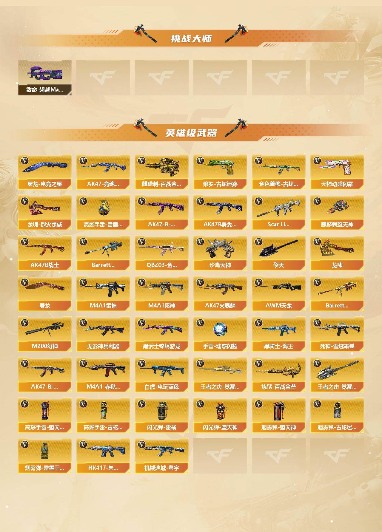 【英雄级武器】:AK47-火麒麟,M4A1-雷神*2,M4A1-死神,Scar Light-白虎,无影-神兵利器,黑武士-锦绣游龙,金色蔷薇-古蛇迷踪,死神-雪域霜狐,QBZ03-金色蔷薇*2,AK47-B-战神*2,黑骑士-海王,AK47-B-常胜将军,白虎-电玩蓝兔,HK417-朱雀-电竞之星,机械迷城-穹宇,AK47-B-身先士卒,AK47-B-战士,AWM-天龙,M200-幻神,Barrett-朱雀,王者之决-觉醒版,Barrett-暗月传说*6,炼狱-百战金芒,沙鹰-天神*2,天神-动感闪耀,修罗-古蛇迷踪,屠龙,龙啸,麒麟刺-堕天神,
