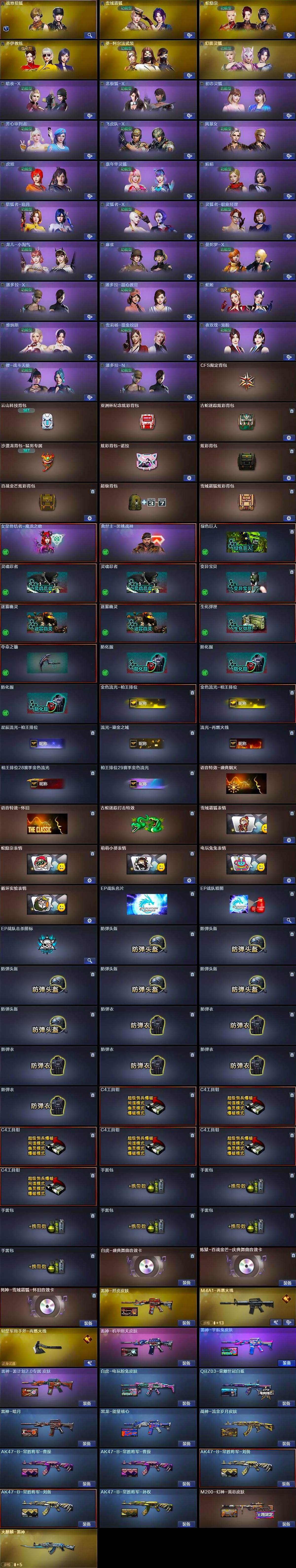 【皮肤】:M200-幻神-黄忠皮肤,白虎-电玩粉兔皮肤,QBZ03-荣耀世冠白鲨,雷神-暗月,雷神-烈虎皮肤,雷神-机甲刑天皮肤,雷神-宇航兔皮肤,雷神-源计划2.0专属 皮肤,M4A1-再燃火线,火麒麟-雷神,黑龙-能量核心,战神-流金岁月皮肤,AK47-B-常胜将军-曹操*2,AK47-B-常胜将军-刘备*2,AK47-B-常胜将军-孙权,轻型军用手斧-再燃火线