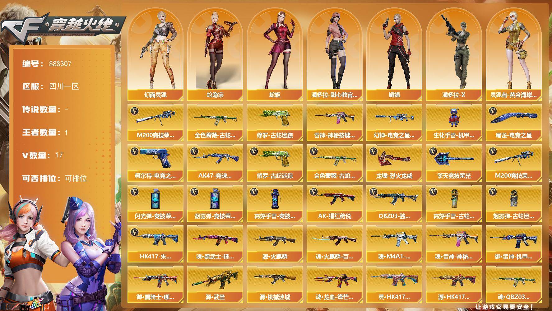 [17817105]四川一区-13V-1王者武器数-0炫金武器数 【热门武器】:金色蔷薇-古蛇迷踪,修罗-古蛇迷踪,M200-竞技荣光 【皮肤】:幻神-电竞之星 皮肤,雷神-神秘按键 皮肤 【角色】:蛇隐宗,幻面灵狐,娟娟,灵狐者-黄金海岸,潘多拉-X,潘多拉-甜心教官,蛇姬 【人偶武器】:生化手雷-机甲核心 【英雄级武器】:金色蔷薇-古蛇迷踪,QBZ03-独角-III,AK-47-猩红传说,HK417-朱雀-电竞之星,M200-竞技荣光,柯尔特-电竞之星,修罗-古蛇迷踪,擎天-竞技荣光,屠龙-电竞之星,龙啸-烈火龙威,高爆手雷-竞技荣光,高爆手雷-古蛇迷踪,闪光弹-竞技荣光,烟雾弹-竞技荣光,烟雾弹-古蛇迷踪,AK47-竞魂无影 【源级武器】:源·火麒麟,魂·火麒麟-百城,魂·M4A1-雷神-化蛇*2,魂·雷神-神秘按键,御·雷神-机甲刑天,御·黑骑士·哪吒闹海,魂·黑武士-锋芒破茧,源·武圣,源·机械迷城,魂·龙血-锋芒破茧,灵·HK417-朱雀-甜蜜火力,源·HK417-朱雀,金色蔷薇-狼王,魂·QBZ03-金色蔷薇-古蛇迷踪,魂·QBZ03-金色蔷薇-萌杀,魂·9A91·烈火-电子连击,源·玫瑰精灵,源·天龙,魂·天龙-彼岸花,魂·裁决-凤灵,魂·裁决-神秘按键,魂·毁灭-秦师,魂·毁灭-神秘黑洞,御·毁灭-黑大圣,魂·Barrett-金色蔷薇-蛇姬,灵·Barrett-金色蔷薇-甜蜜火力,魂·Barrett-朱雀-锦鲤,魂·Barrett-朱雀- 新春神龙,魂·炼狱-电子连击*2,魂·炼狱-玩具枪,魂·炼狱-月*2,源·武圣glock,魂·擎天-蒸汽钟表,源·擎天-萌杀,魂·麒麟刺-月 【道具】:CFS限定背包,古蛇迷踪炫彩背包,超级背包,女皇终结者-魔龙之吻,绿色巨人,灵魂忍者,迷雾幽灵,夺命之镰,防化服*2,流光-鎏金之域,枪王排位29赛季金色流光,古蛇迷踪打击特效,蛇隐宗表情,防弹头盔*3,防弹衣*3,C4工具钳*3,手雷包*3 【特殊枪械】: