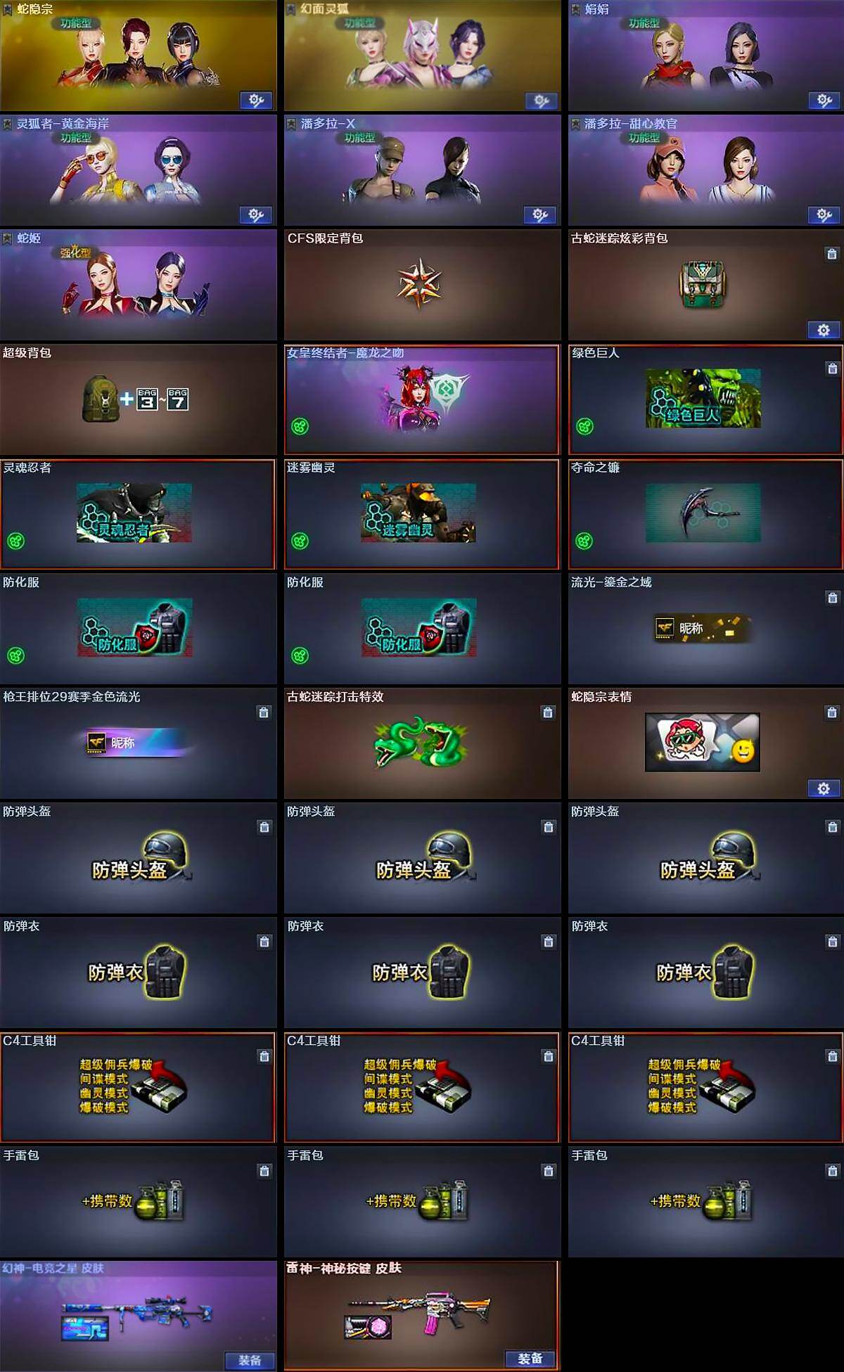 【道具】:CFS限定背包,古蛇迷踪炫彩背包,超级背包,女皇终结者-魔龙之吻,绿色巨人,灵魂忍者,迷雾幽灵,夺命之镰,防化服*2,流光-鎏金之域,枪王排位29赛季金色流光,古蛇迷踪打击特效,蛇隐宗表情,防弹头盔*3,防弹衣*3,C4工具钳*3,手雷包*3