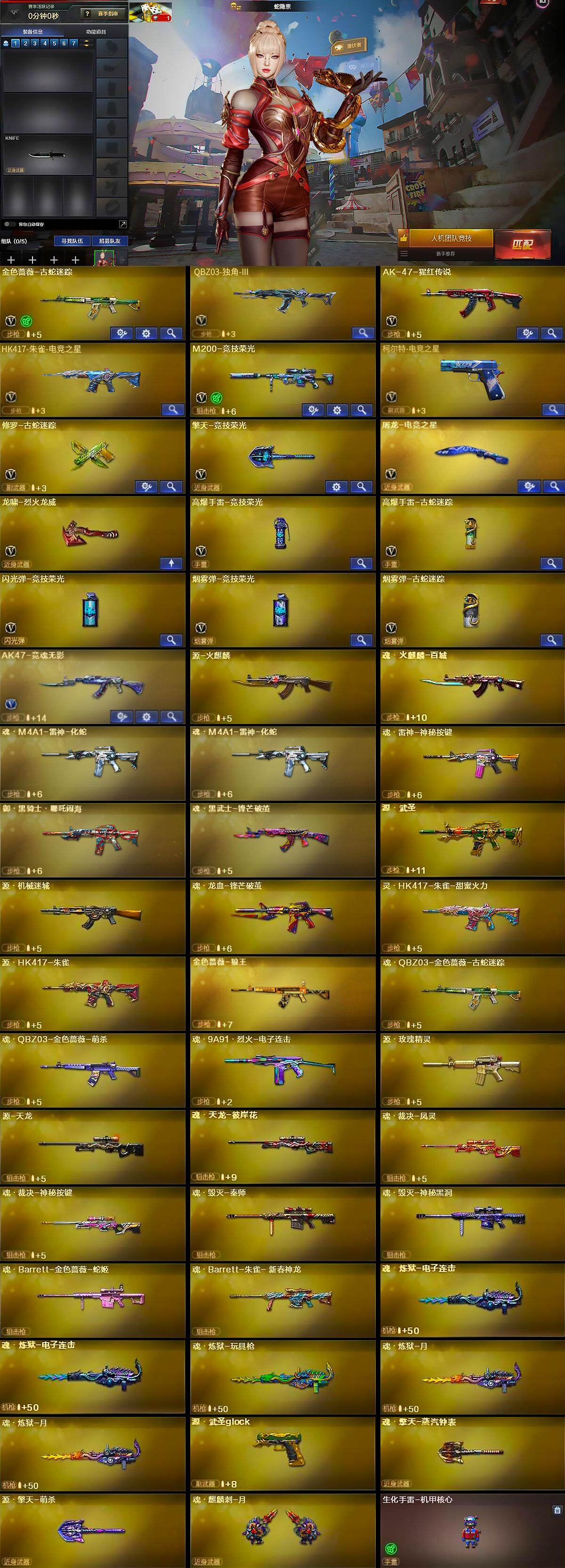 【英雄级武器】:金色蔷薇-古蛇迷踪,QBZ03-独角-III,AK-47-猩红传说,HK417-朱雀-电竞之星,M200-竞技荣光,柯尔特-电竞之星,修罗-古蛇迷踪,擎天-竞技荣光,屠龙-电竞之星,龙啸-烈火龙威,高爆手雷-竞技荣光,高爆手雷-古蛇迷踪,闪光弹-竞技荣光,烟雾弹-竞技荣光,烟雾弹-古蛇迷踪,AK47-竞魂无影