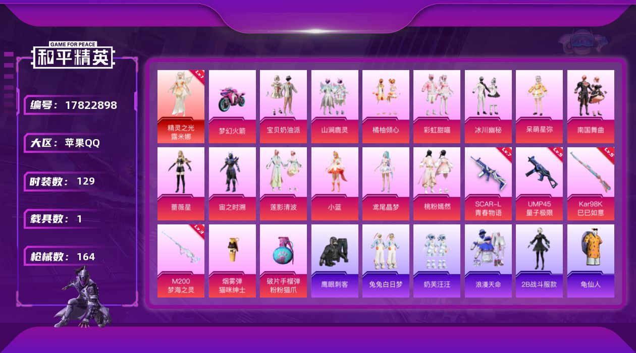 [17822898]苹果 手Q-1神装-13粉装-6特效枪-1载具-7粉色飞行器-57830热力值-7王牌印记-129套装-164枪皮