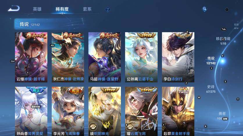 【传说皮肤】:云缨神骥越千峰,狄仁杰神骥赴朔漠,马超神骥逐星野,公孙离云诺千山,李白诗剑行,孙尚香异界灵契,李元芳飞鸢探春,镜炽阳神光,曜云鹰飞将,后羿黄金射手座,孙尚香末日机甲,宫本武藏地狱之眼