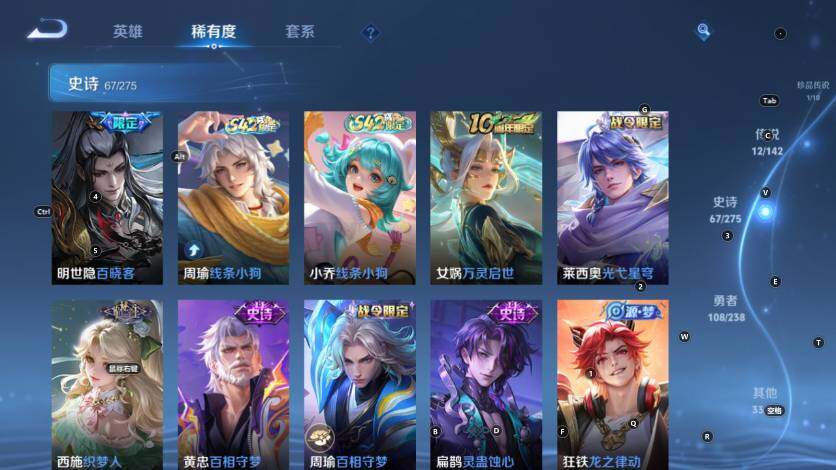 【史诗皮肤】:明世隐百晓客,周瑜线条小狗,小乔线条小狗,女娲万灵启世,莱西奥光弋星穹,西施织梦人,黄忠百相守梦,周瑜百相守梦,扁鹊灵蛊蚀心,狂铁龙之律动,牛魔星界战将,姬小满妄想食味,蒙恬荣光圣徽,高渐离燃音魔法,妲己灵卜魔法,周瑜雪夜绮愿,司空震地狱燃心,赵怀真鹤归松