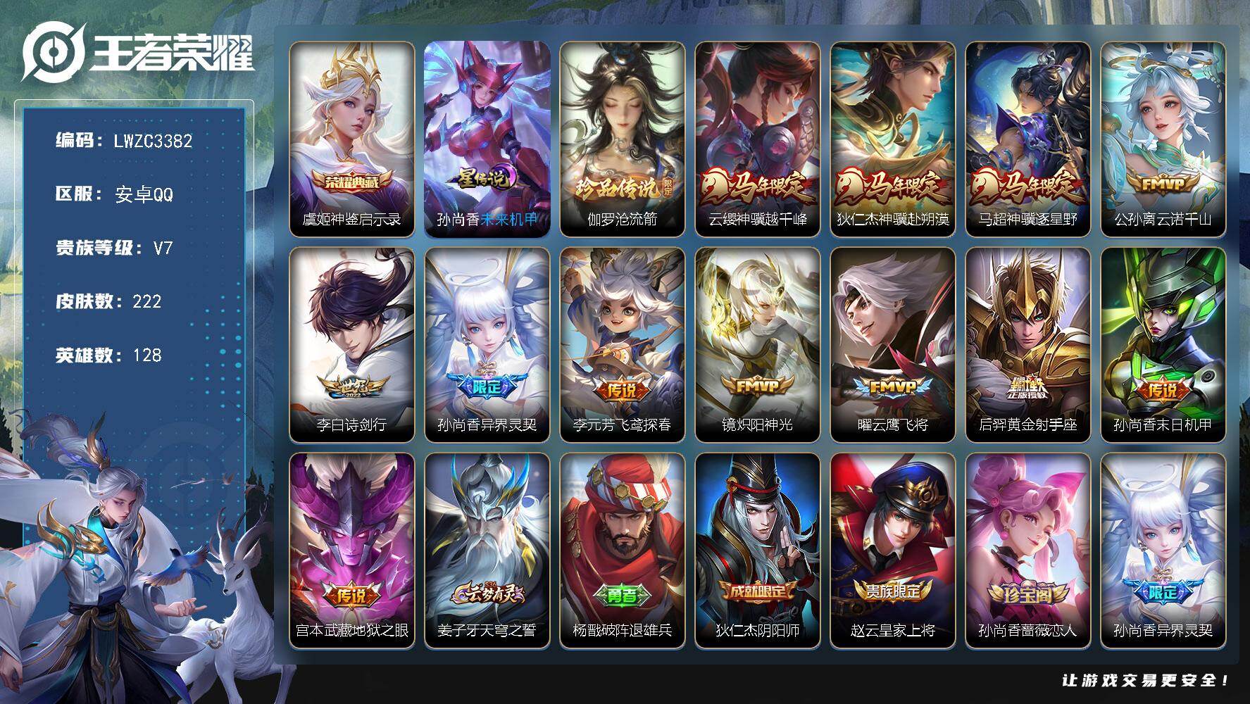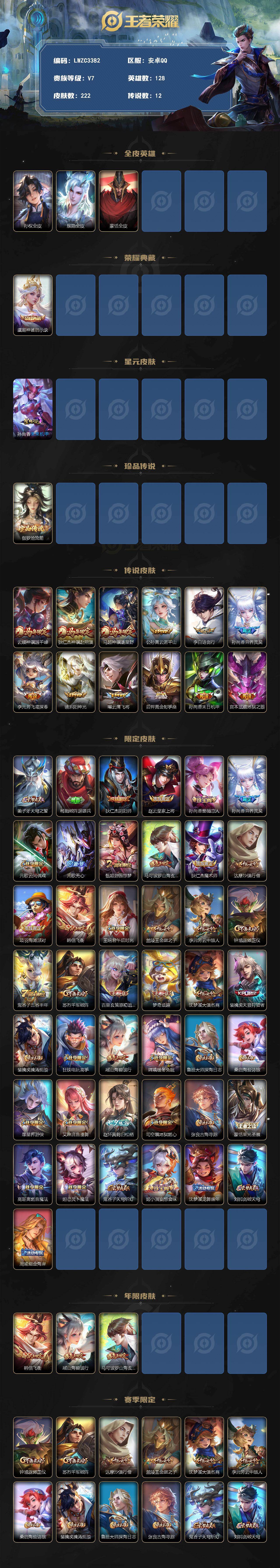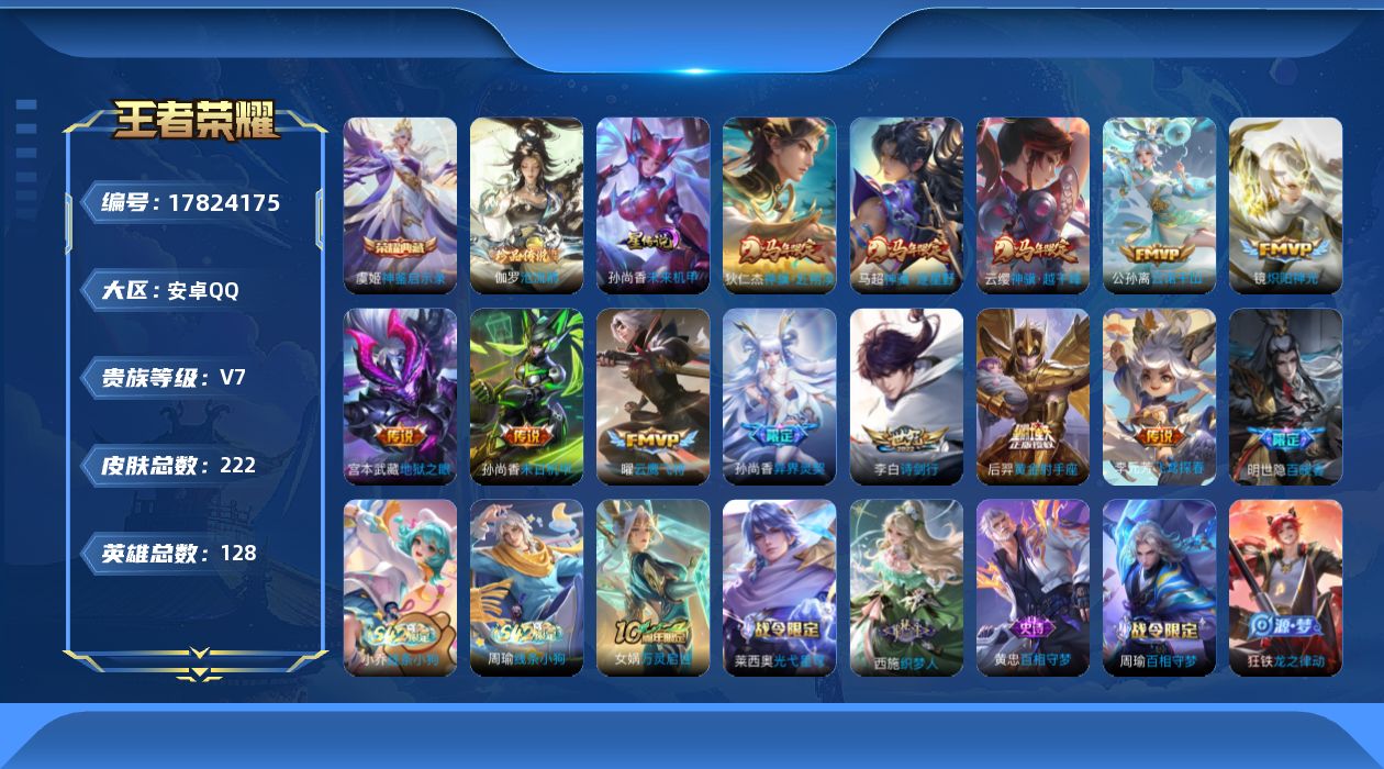 [17824175]【特价出售/店主推荐/不包人脸】安卓Q-V7-最强王者段位-128英雄-222皮肤-1典藏皮肤-1珍品传说-1星传说-12传说-66史诗