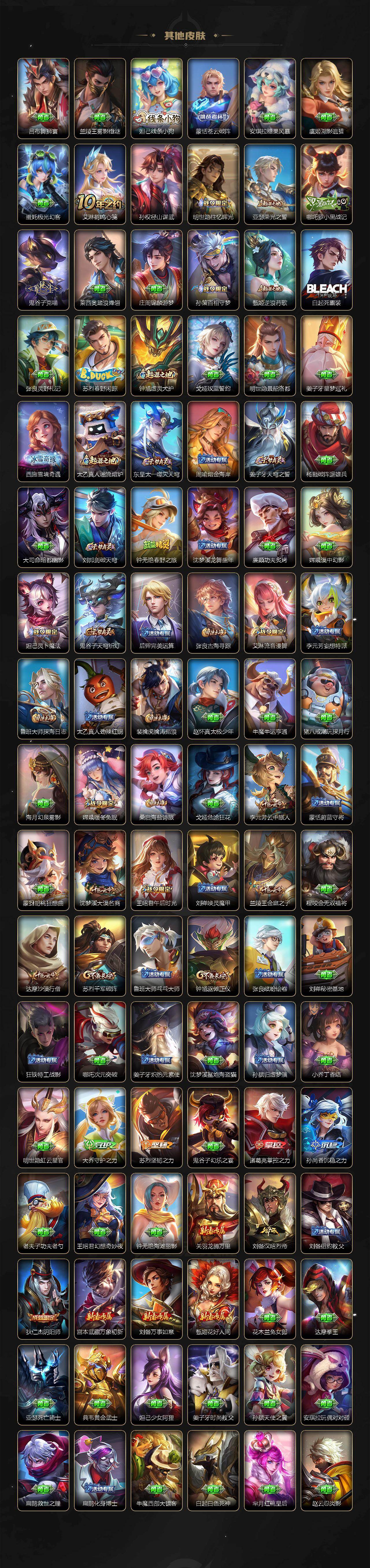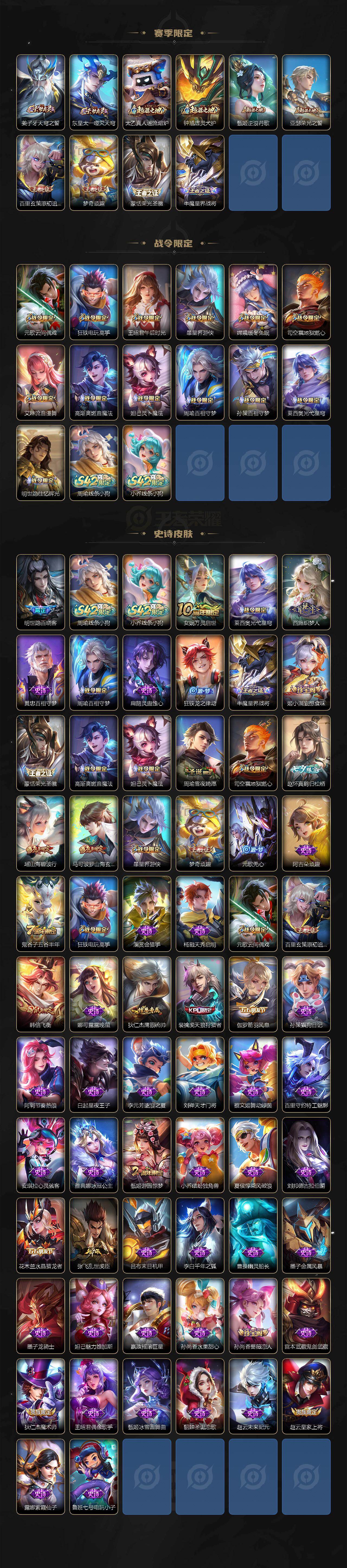 【赛季限定】:钟馗驱傩正仪,苏烈千军破阵,达摩沙漠行僧,兰陵王金庭之子,沈梦溪大漠名商,李元芳云中旅人,桑启海盐诗旅,裴擒虎擒涛扼浪,鲁班大师探海日志,张良古海寻踪,鬼谷子天穹祈灯,刘邦剑破天穹,姜子牙天穹之誓,东皇太一噬灭天穹,太乙真人谧流熔炉,钟馗虚灵犬护,甄姬逆浪荇歌,亚瑟荣光之誓,百里玄策原初追逐者,梦奇顽趣,蒙恬荣光圣徽,牛魔星界战将