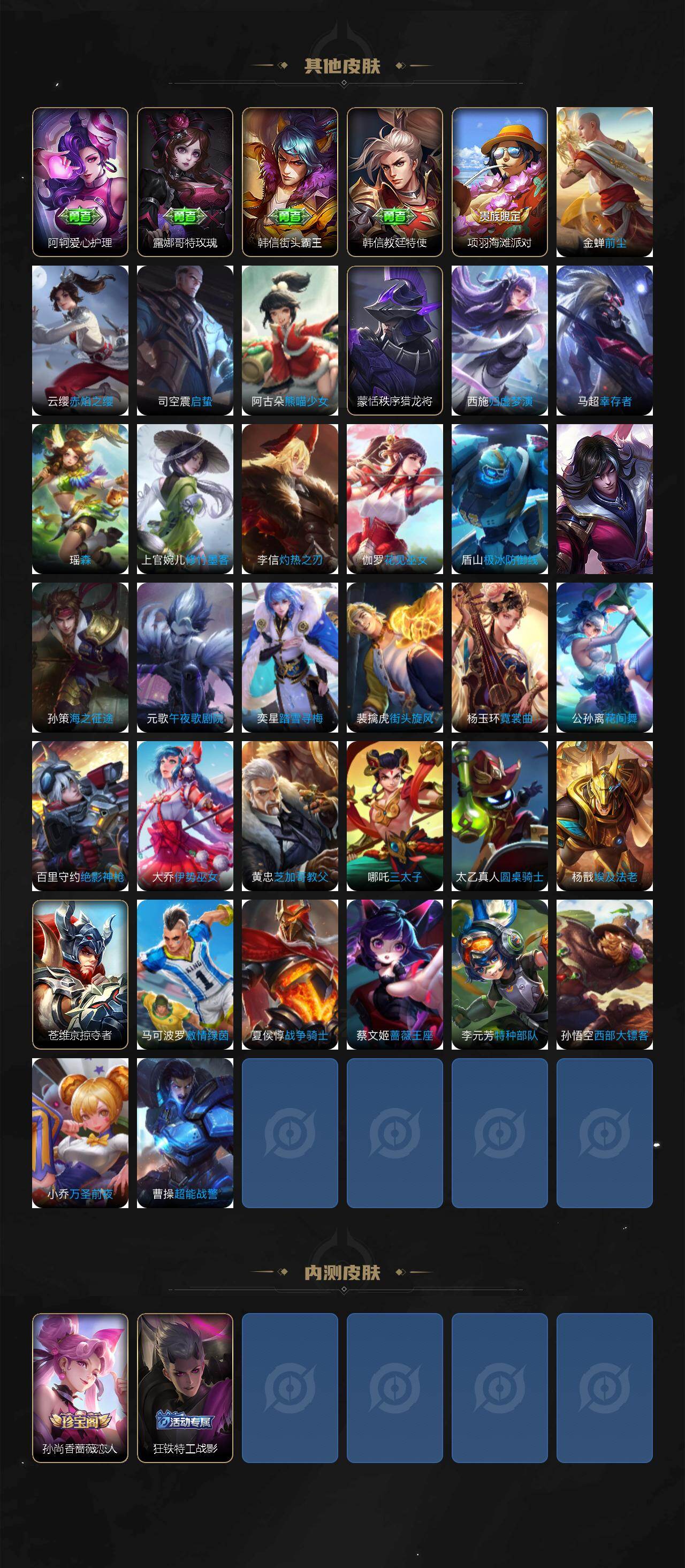 娜可露露晚萤,伽罗箭羽风息,李元芳逐浪之夏,孙策猫狗日记,阿轲节奏热浪,露娜紫霞仙子,王昭君偶像歌手,雅典娜冰冠公主,吕布末日机甲,鲁班七号电玩小子,墨子龙骑士,嬴政摇滚巨星,刘禅天才门将,白起星夜王子,安琪拉心灵骇客,刘邦德古拉伯爵,曹操幽灵船长,宫本武藏鬼剑武藏,杨戬天秀·启明,蔡文姬舞动绿茵,小乔缤纷独角兽,夏侯惇乘风破浪,花木兰水晶猎龙者,墨子金属风暴,百里玄策原初追逐者,貂蝉圣诞恋歌,百里守约特工魅影,李白千年之狐,澜赏金猎手,阿古朵顽趣,赵怀真鹤归松栖,周瑜雪夜绮愿,高渐离燃音魔法