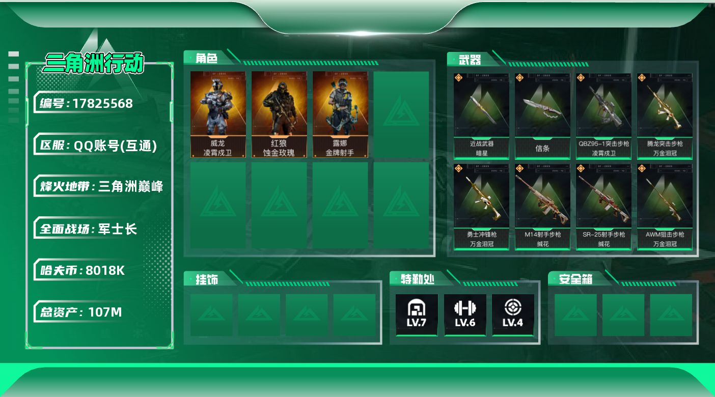 [17825568]107m总资产-8018k哈夫币-60烽火等级-三角洲巅峰-20战场等级-军士长 【干员外观】:红狼-蚀金玫瑰,威龙-凌霄戍卫,露娜-金牌射手 【近战皮肤】:近战-暗星,近战-信条,近战-黑鹰 【传说外观】:M4A1突击步枪-蚀金玫瑰,QBZ95-1突击步枪-凌霄戍卫,SG552突击步枪-运动员,腾龙突击步枪-万金泪冠,MK47突击步枪-暗星,P90冲锋枪-信条,SR-3M紧凑突击步枪-暗星,勇士冲锋枪-万金泪冠,M14射手步枪-蛮荒,M14射手步枪-缄花,SR-25射手步枪-信条,SR-25射手步枪-缄花,AWM狙击步枪-万金泪冠,.357左轮-缄花 【史诗外观】:K416突击步枪-腊梅,K416突击步枪-阿萨拉特攻,AUG突击步枪-蝮蛇,M7战斗步枪-百步穿杨,SG552突击步枪-哈夫克警备,G3战斗步枪-流沙送葬,AS Val突击步枪-百步穿杨,腾龙突击步枪-猎鳄行动,MP5冲锋枪-竞技风,Vector冲锋枪-百步穿杨,MP7冲锋枪-六套之力,M249轻机枪-丛影谍踪,QJB201轻机枪-炽焰,VSS射手步枪-丛影谍踪,M14射手步枪-工业狂潮,M700狙击步枪-百步穿杨,M700狙击步枪-哈夫克警备,AWM狙击步枪-流沙送葬,沙漠之鹰-曙光 【稀有外观】:As Val突击步枪-星之彩,M700狙击步枪-旧梦,AUG突击步枪-旧梦,SG552突击步枪-巨兽,SR-3M紧凑突击步枪-巨兽,M4A1突击步枪-繁盛,AKM突击步枪-肃杀,ASh-12战斗步枪-繁盛,K416突击步枪-一帆风顺,M7战斗步枪-精英联盟,SG552突击步枪-2026,SG552突击步枪-马年新春,SG552突击步枪-贴花艺术,SCAR-H战斗步枪-荣耀列队,G3战斗步枪-主宰,CAR-15突击步枪-来财,腾龙突击步枪-精英联盟,KC17突击步枪-来财,MP5冲锋枪-哈夫克卫队,Vector冲锋枪-先锋,SMG-45冲锋枪-行动开启,SR-3M紧凑突击步枪-马年新春,勇士冲锋枪-主宰,勇士冲锋枪-冰天雪地,QCQ171冲锋枪-银鹭,M249轻机枪-冰天雪地,SKS射手步枪-弄臣,SR-25射手步枪-开拓,PSG-1射手步枪-主宰,SV-98狙击步枪-星链科技,SV-98狙击步枪-哈夫克航天,SV-98狙击步枪-精英联盟,QSZ92G-一帆风顺 【普通外观】:腾龙突击步枪-古铜,M7战斗步