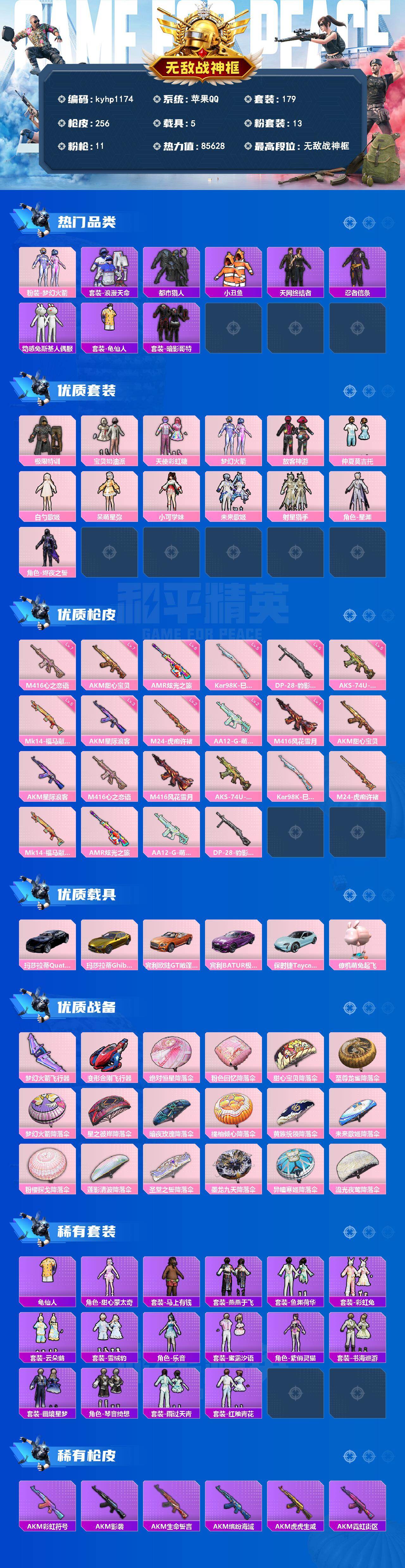 [17825581]苹果 手Q-无敌战神框-13粉装-11特效枪-5载具-2粉色飞行器-85628热力值-11王牌印记-179套装-256枪皮 【热门品类】:粉装-梦幻火箭,套装-浪漫天命,套装-都市猎人,套装-小丑鱼,套装-天网终结者,套装-忍者信条,套装-动感兔斯基人偶服,套装-龟仙人,套装-暗影哥特 【粉色套装】:粉装-极限特训,粉装-宝贝奶油派,粉装-天使彩虹糖,粉装-梦幻火箭,粉装-放客神游,粉装-仲夏莫吉托,角色-白勺歌姬,角色-呆萌星弥,角色-小可学妹,粉装-未来歌姬,粉装-射星猎手,角色-星渊,角色-烬夜之誓 【粉色枪皮等级】:AKM-甜心宝贝(七级),AKM-星际浪客(三级),M416-心之恋语(七级),M416-风花雪月(一级),AKS-74U-森灵之息(五级),Kar98K-巳巳如意(五级),M24-虎痴许褚(二级),Mk14-福马献瑞(五级),AMR-炫光之旅(六级),AA12-G-萌骑幻想(二级),DP-28-豹影疾电(五级) 【粉色载具】:玛莎拉蒂Quattroporte(夜幕蓝),玛莎拉蒂Ghibli(金),宾利欧陆GT敞篷(火焰橘),宾利BATUR(极速紫),保时捷Taycan 旅行版(冰晶蓝),僚机-萌兔起飞 【粉色枪皮】:AKM-甜心宝贝,AKM-星际浪客,M416-心之恋语,M416-风花雪月,AKS-74U-森灵之息,Kar98K-巳巳如意,M24-虎痴许褚,Mk14-福马献瑞,AMR-炫光之旅,AA12-G-萌骑幻想,DP-28-豹影疾电 【粉色飞行器】:梦幻火箭飞行器,变形金刚飞行器 【粉色降落伞】:绝对恒星降落伞,粉色回忆降落伞,甜心宝贝降落伞,至尊龙雀降落伞,梦幻火箭降落伞,星之彼岸降落伞,暗夜玫瑰降落伞,橘柚倾心降落伞,黄族统领降落伞,未来歌姬降落伞,粉樱探戈降落伞,莲影清波降落伞,圣堂之誓降落伞,墨龙九天降落伞,异瞳寒姬降落伞,流光夜莺降落伞 【稀有套装】:套装-龟仙人,角色-甜心蒙太奇,套装-雪国风尚,套装-马上有钱,套装-燕燕于飞,套装-鱼渊荷华,套装-彩虹兔,套装-云朵鹅,套装-雪绒豹,角色-乐音,套装-蜜露汐语,角色-紫俏灵猫,套装-书海巡游,套装-画境星梦,套装-琴音绮想,套装-雨过天青,套装-红釉青花 【稀有枪皮】:AKM-彩虹符号,AKM-影袭,AKM-生命誓言,AKM-缤纷海域,AKM-虎虎生威,AKM-霓虹街区,A