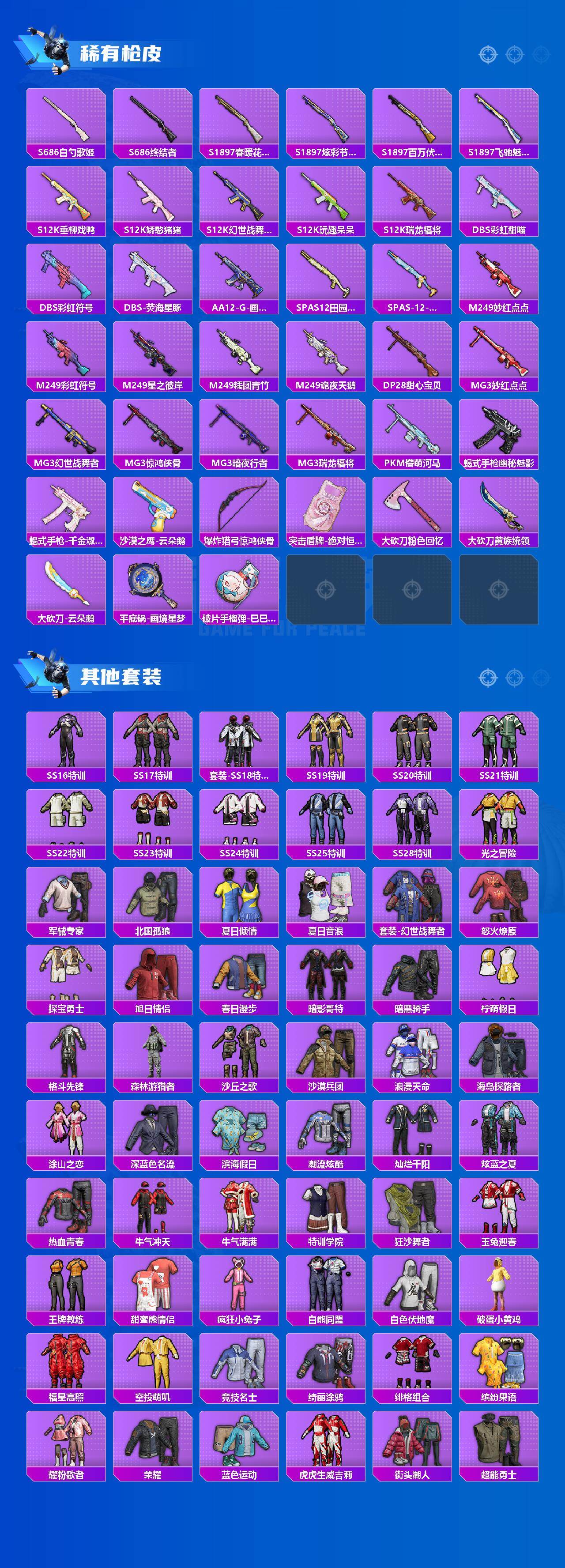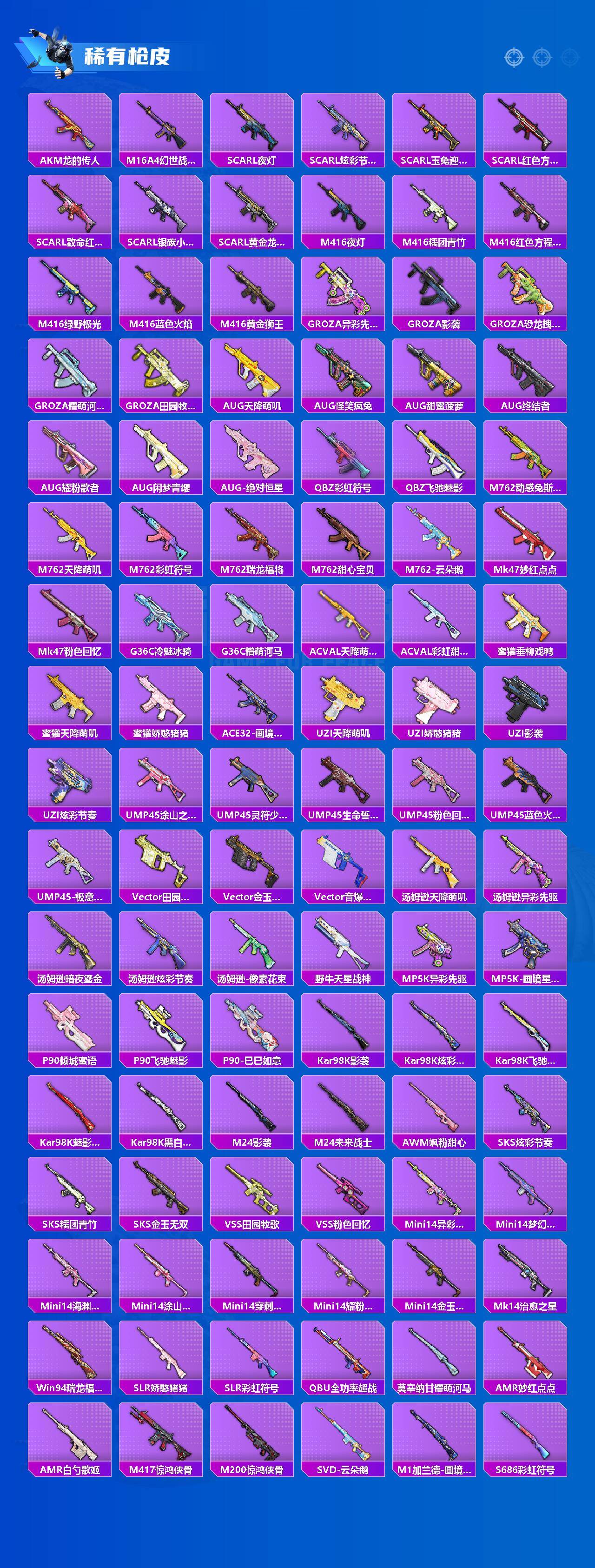 【粉色枪皮】:AKM-甜心宝贝,AKM-星际浪客,M416-心之恋语,M416-风花雪月,AKS-74U-森灵之息,Kar98K-巳巳如意,M24-虎痴许褚,Mk14-福马献瑞,AMR-炫光之旅,AA12-G-萌骑幻想,DP-28-豹影疾电