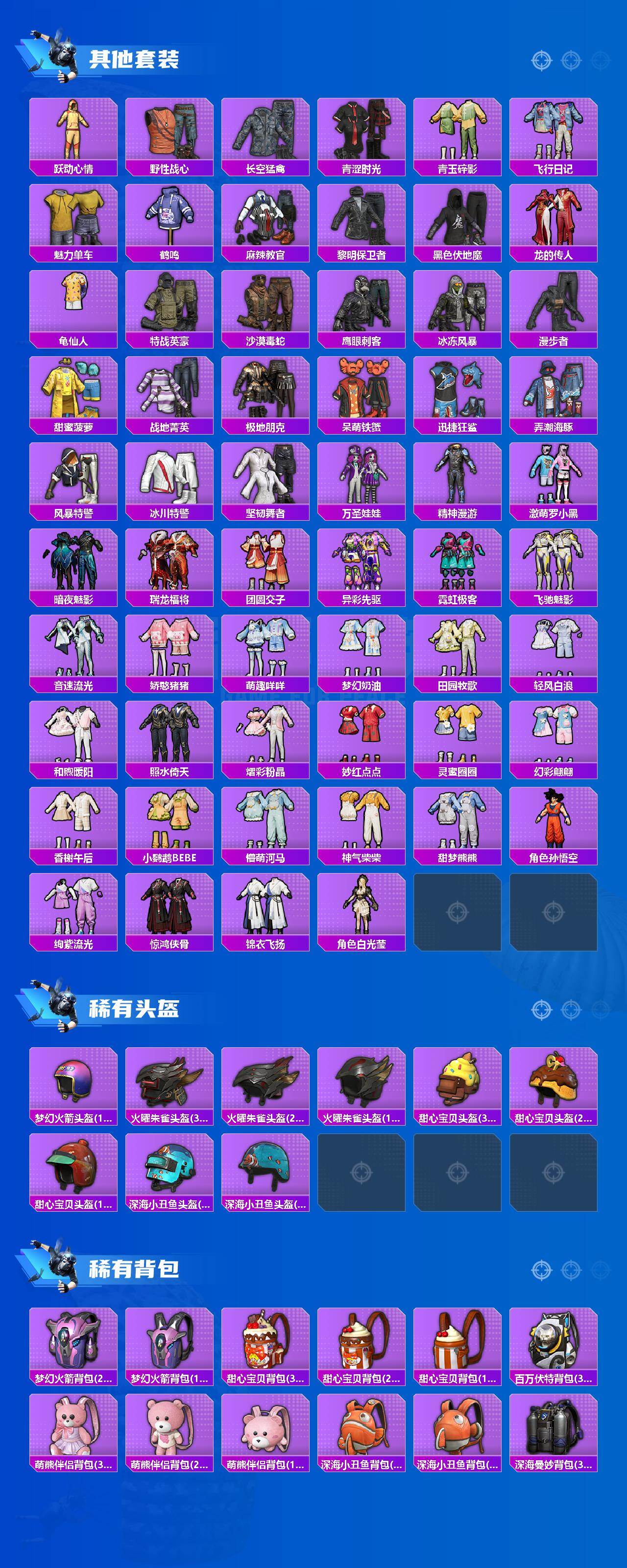 套装-梦幻火箭,套装-都市猎人,套装-极限特训,套装-宝贝奶油派,套装-天使彩虹糖,套装-放客神游,套装-仲夏莫吉托,角色-白勺歌姬,角色-呆萌星弥,角色-小可学妹,套装-未来歌姬,套装-射星猎手,套装-鹰眼刺客,套装-呆萌铁蟹,套装-迅捷狂鲨,套装-万圣娃娃