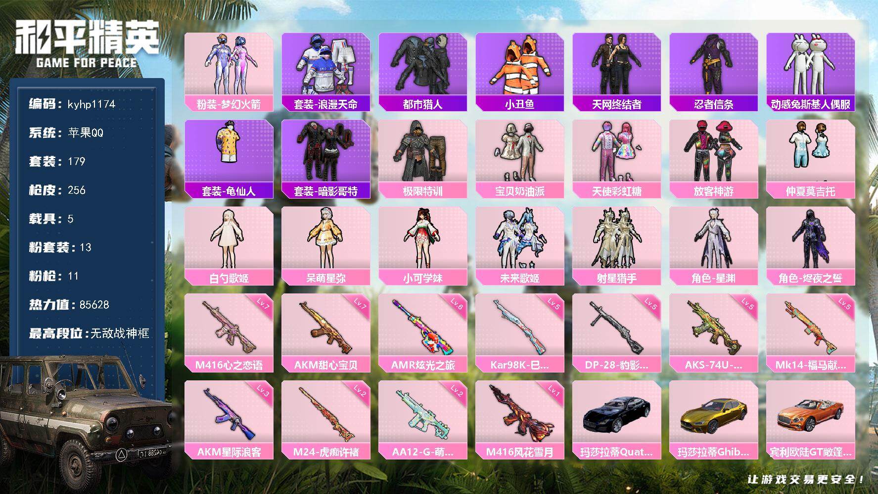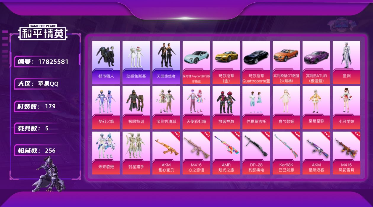 [17825581]苹果 手Q-无敌战神框-13粉装-11特效枪-5载具-2粉色飞行器-85628热力值-11王牌印记-179套装-256枪皮