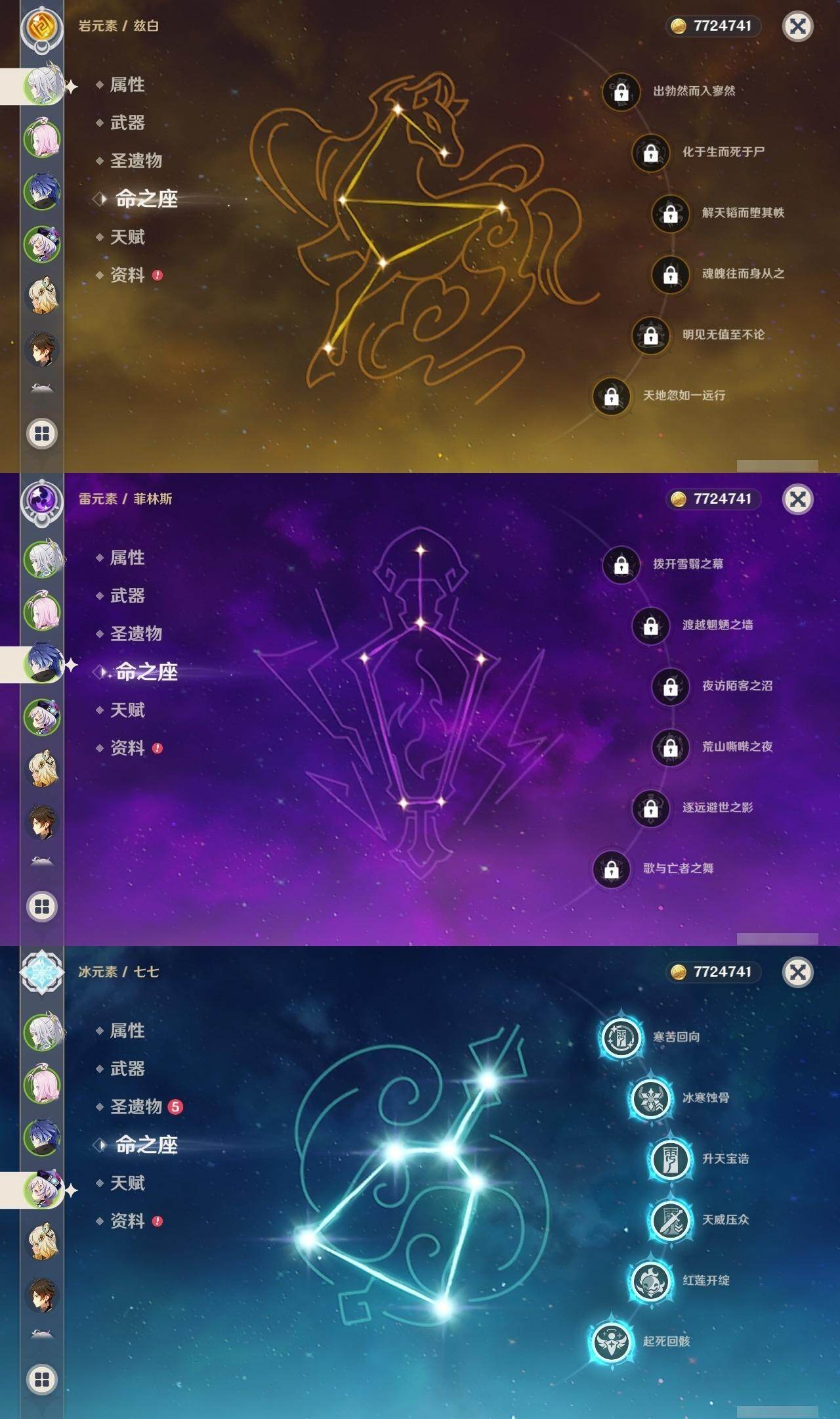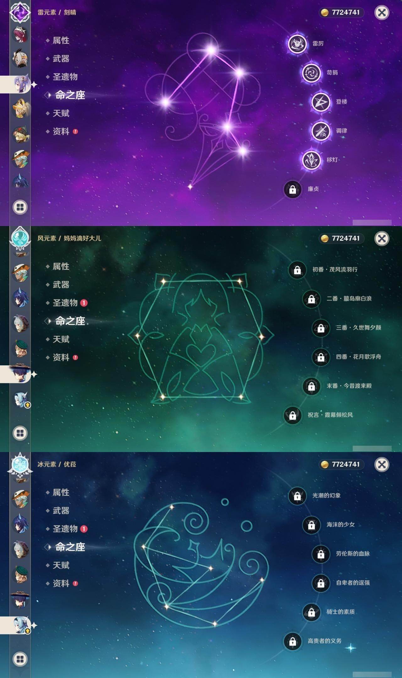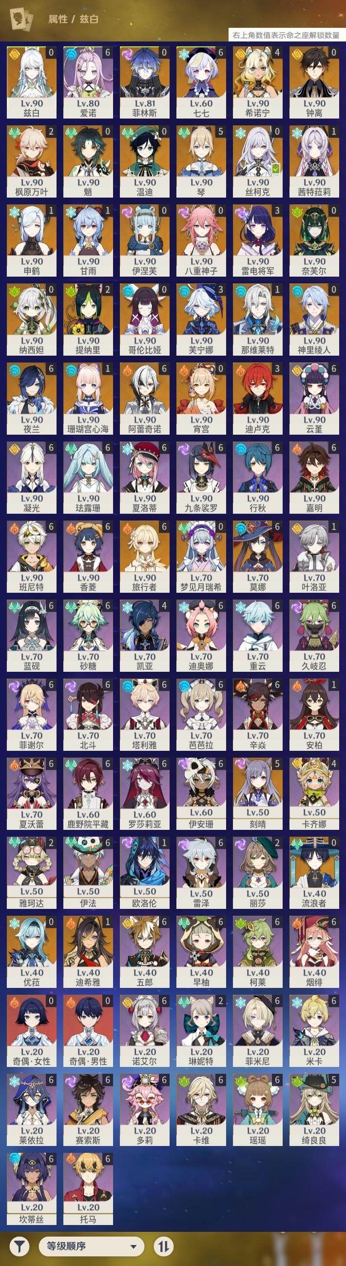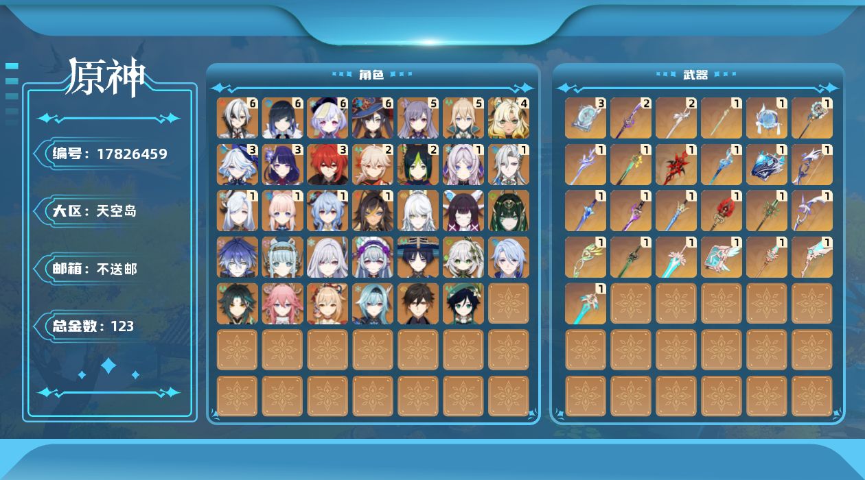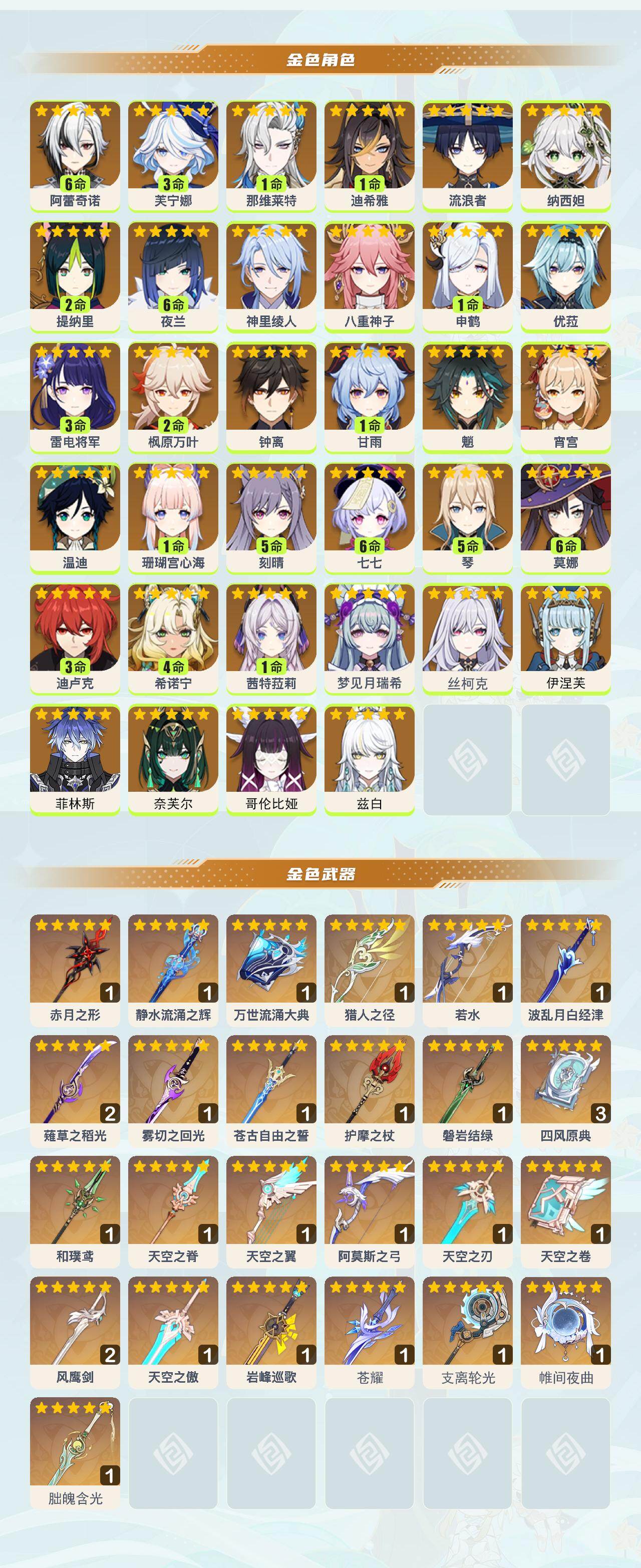 满命阿蕾奇诺,3命芙宁娜,1命那维莱特,1命迪希雅,0命流浪者,0命纳西妲,2命提纳里,满命夜兰,0命神里绫人,0命八重神子,1命申鹤,0命优菈,3命雷电将军,2命枫原万叶,0命钟离,1命甘雨,0命魈,0命宵宫,0命温迪,1命珊瑚宫心海,5命刻晴,满命七七,5命琴,满命莫娜,3命迪卢克,4命希诺宁,1命茜特菈莉,0命梦见月瑞希,0命丝柯克,0命伊涅芙,0命菲林斯,0命奈芙尔,0命哥伦比娅,0命兹白,精1赤月之形,精1静水流涌之辉,精1万世流涌大典,精1猎人之径,精1若水,精1波乱月白经津,精2薙草之稻光,精1雾切之回光,精1苍古自由之誓,精1护摩之杖,精1磐岩结绿,精3四风原典,精1和璞鸢,精1天空之脊,精1天空之翼,精1阿莫斯之弓,精1天空之刃,精1天空之卷,精2风鹰剑,精1天空之傲,精1岩峰巡歌,精1苍耀,精1支离轮光,精1帷间夜曲,精1朏魄含光