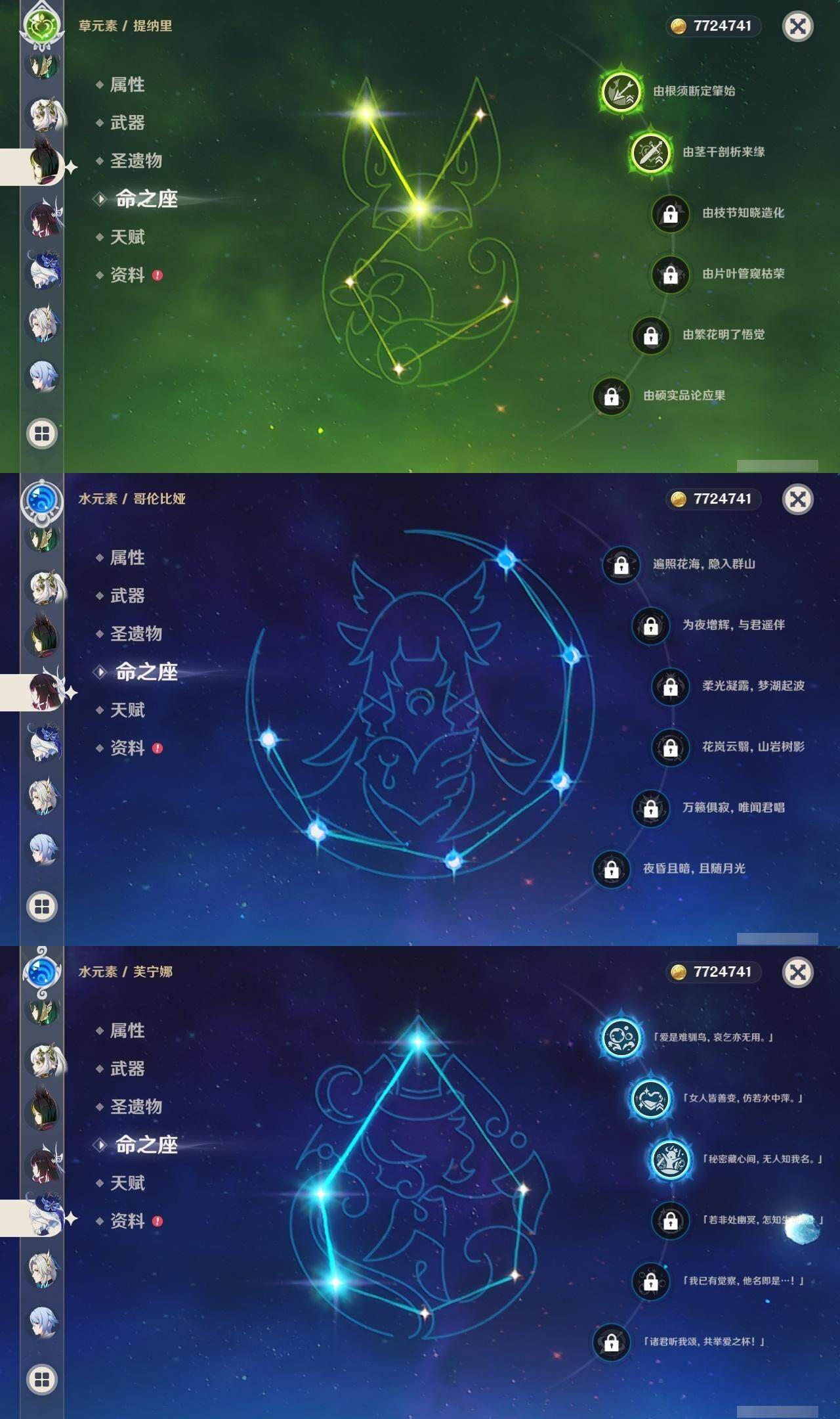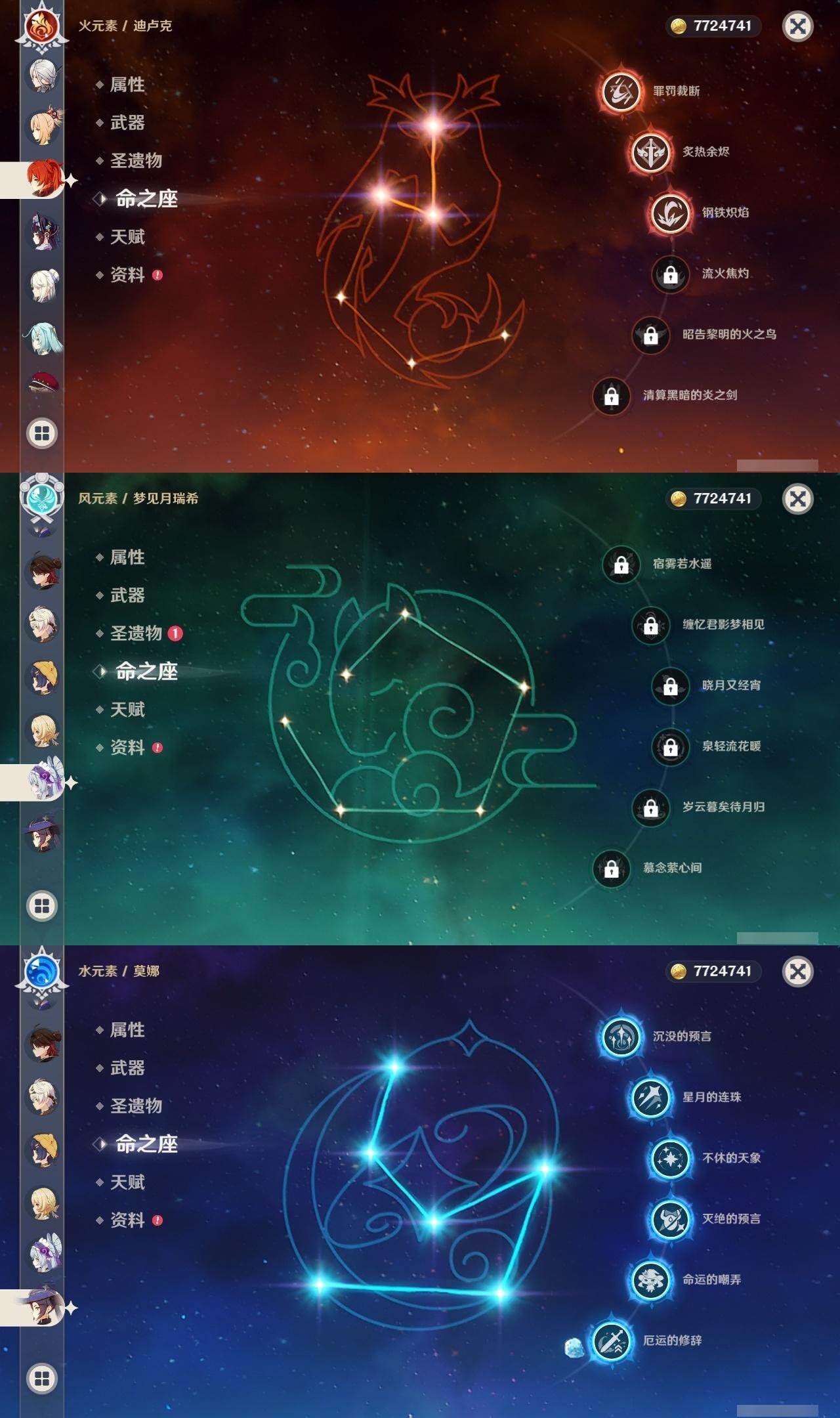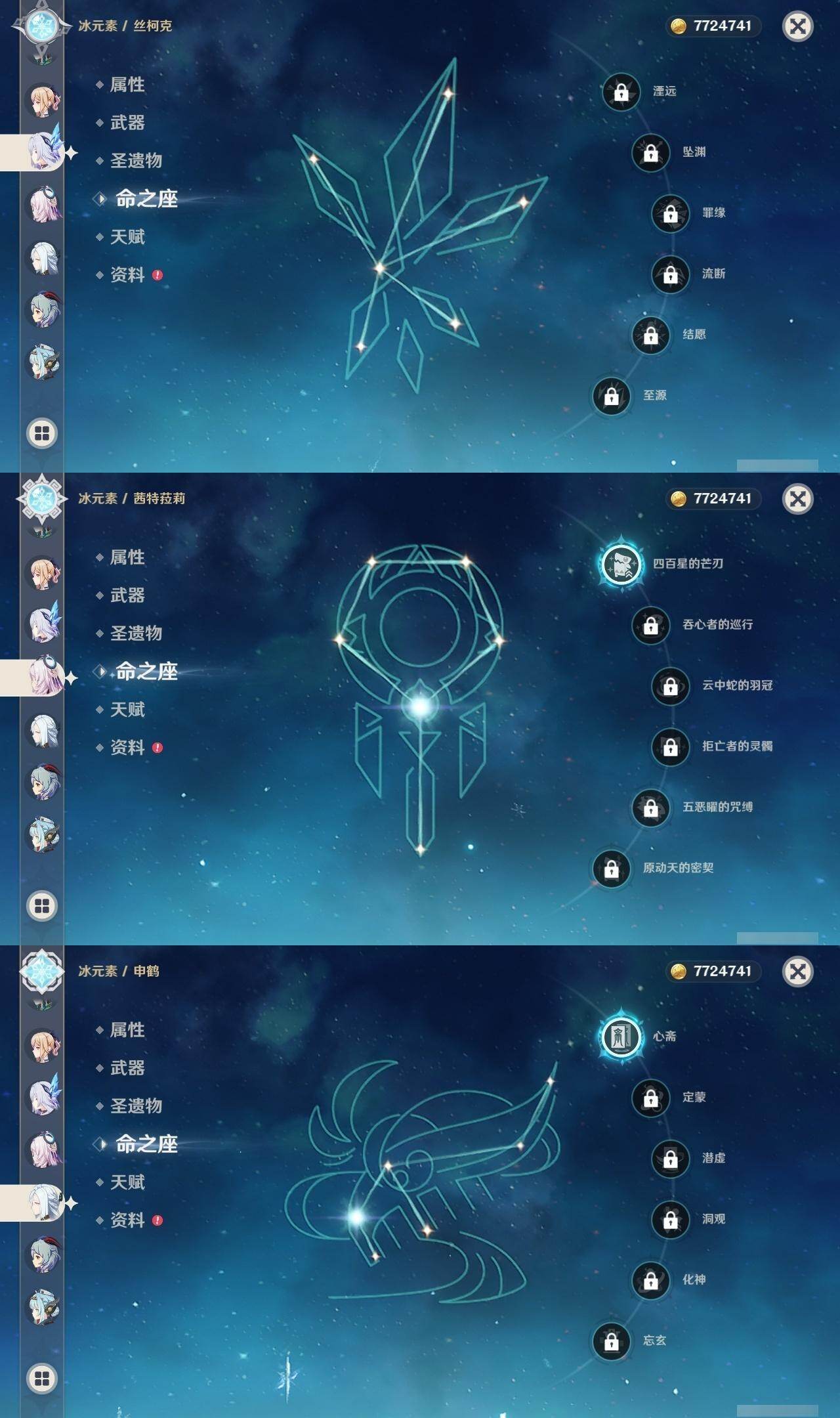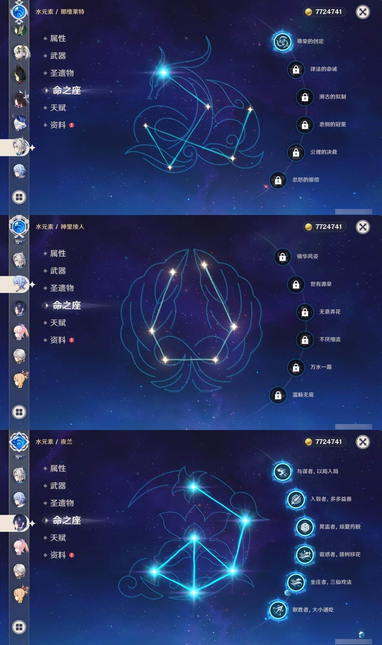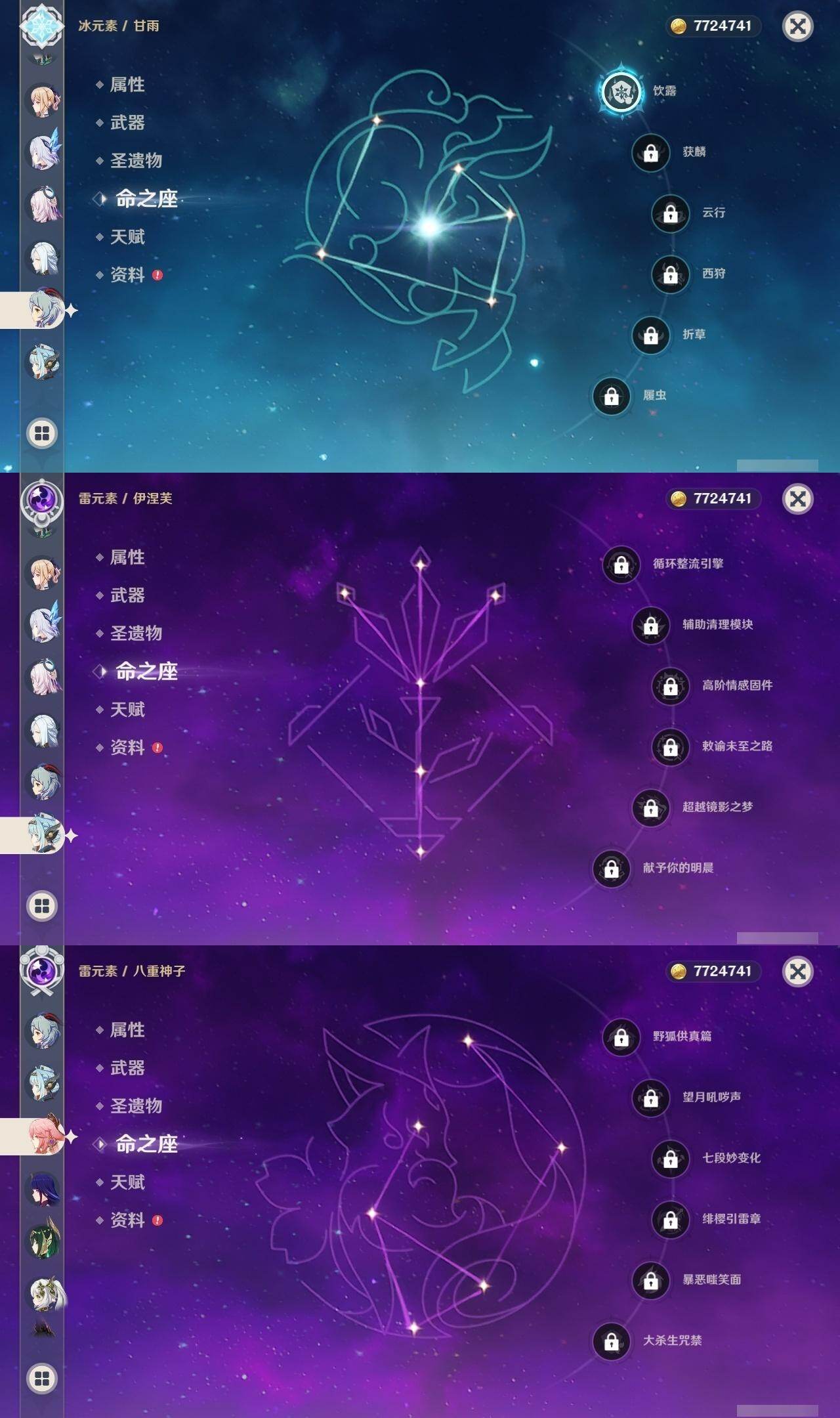 满命阿蕾奇诺,3命芙宁娜,1命那维莱特,1命迪希雅,0命流浪者,0命纳西妲,2命提纳里,满命夜兰,0命神里绫人,0命八重神子,1命申鹤,0命优菈,3命雷电将军,2命枫原万叶,0命钟离,1命甘雨,0命魈,0命宵宫,0命温迪,1命珊瑚宫心海,5命刻晴,满命七七,5命琴,满命莫娜,3命迪卢克,4命希诺宁,1命茜特菈莉,0命梦见月瑞希,0命丝柯克,0命伊涅芙,0命菲林斯,0命奈芙尔,0命哥伦比娅,0命兹白,精1赤月之形,精1静水流涌之辉,精1万世流涌大典,精1猎人之径,精1若水,精1波乱月白经津,精2薙草之稻光,精1雾切之回光,精1苍古自由之誓,精1护摩之杖,精1磐岩结绿,精3四风原典,精1和璞鸢,精1天空之脊,精1天空之翼,精1阿莫斯之弓,精1天空之刃,精1天空之卷,精2风鹰剑,精1天空之傲,精1岩峰巡歌,精1苍耀,精1支离轮光,精1帷间夜曲,精1朏魄含光