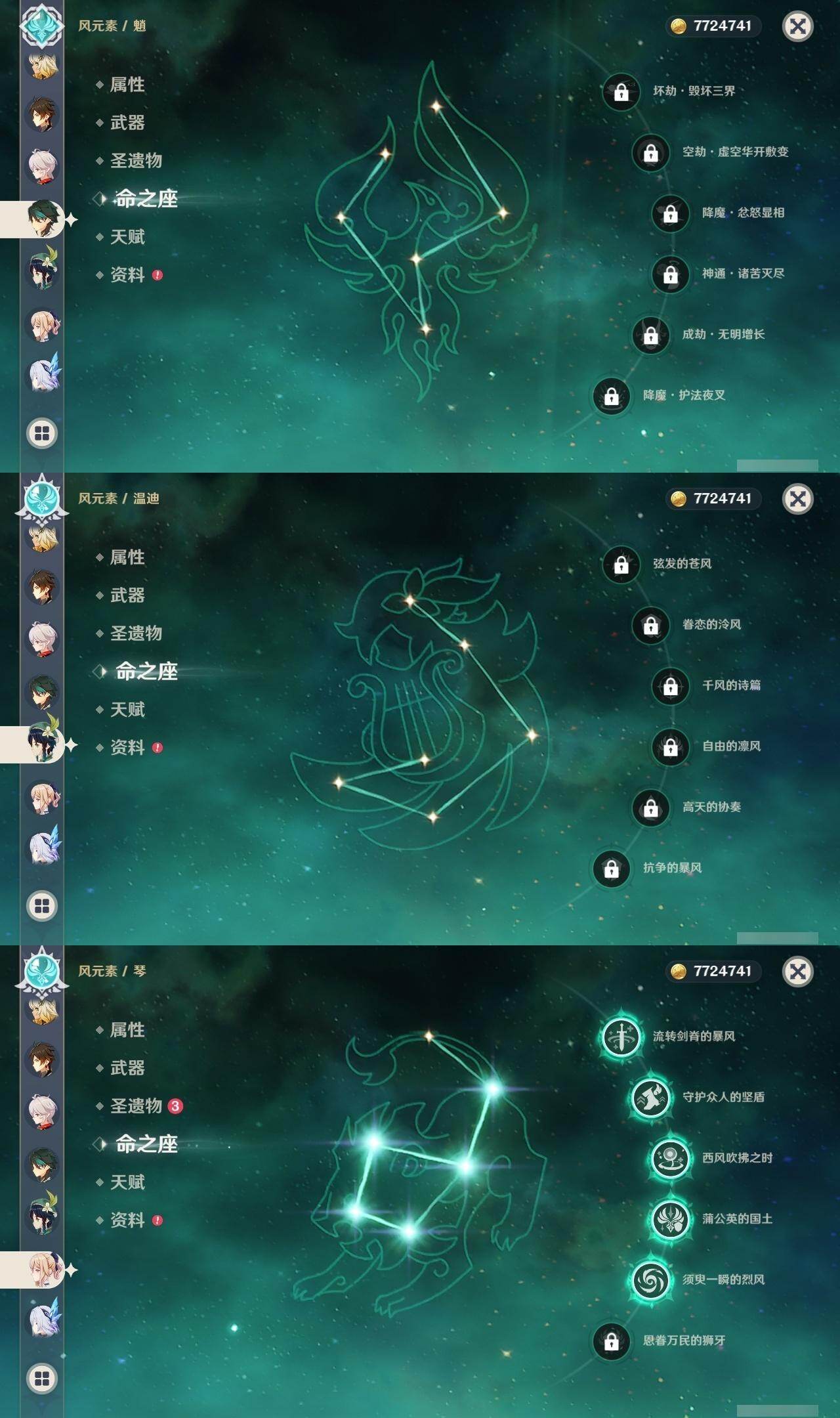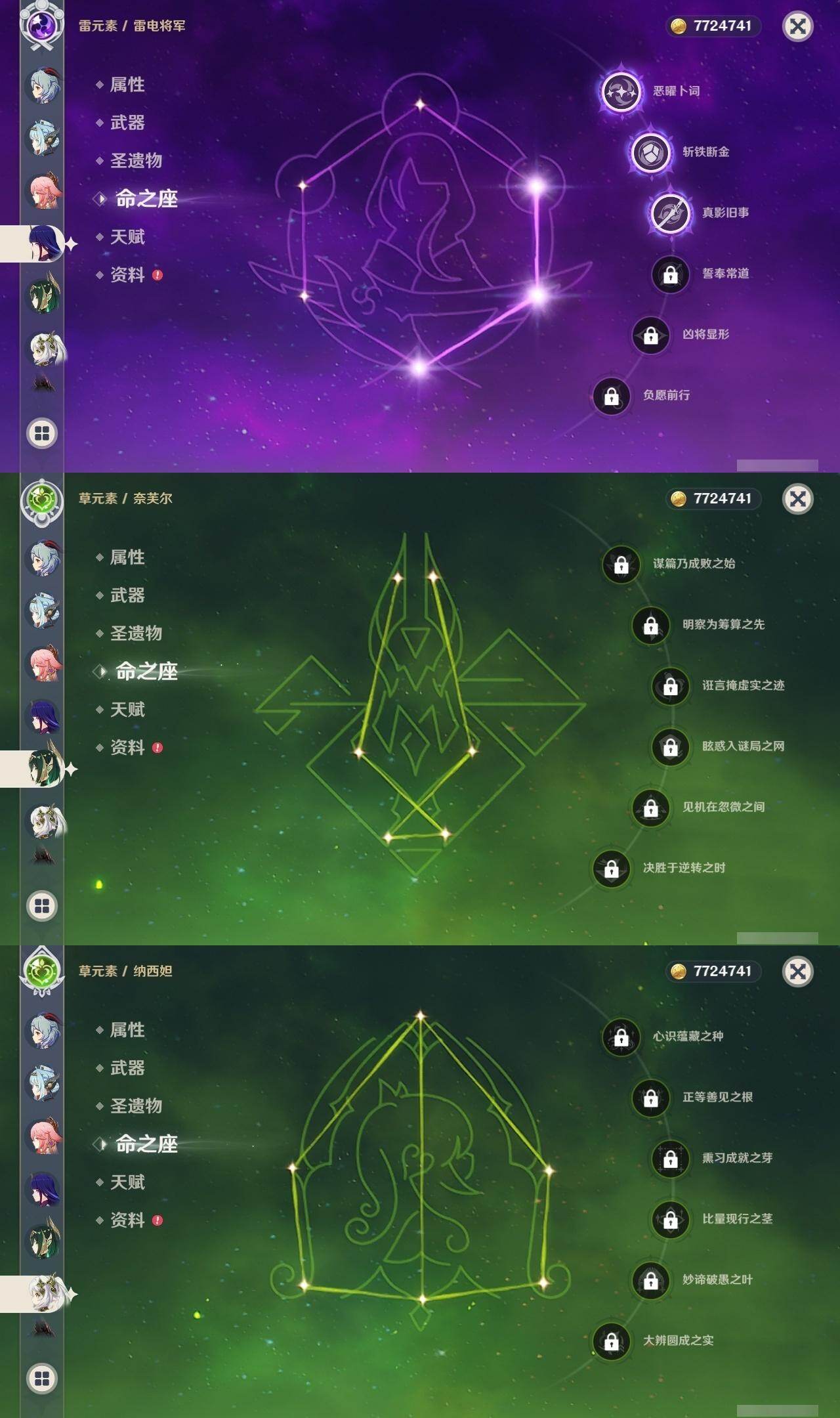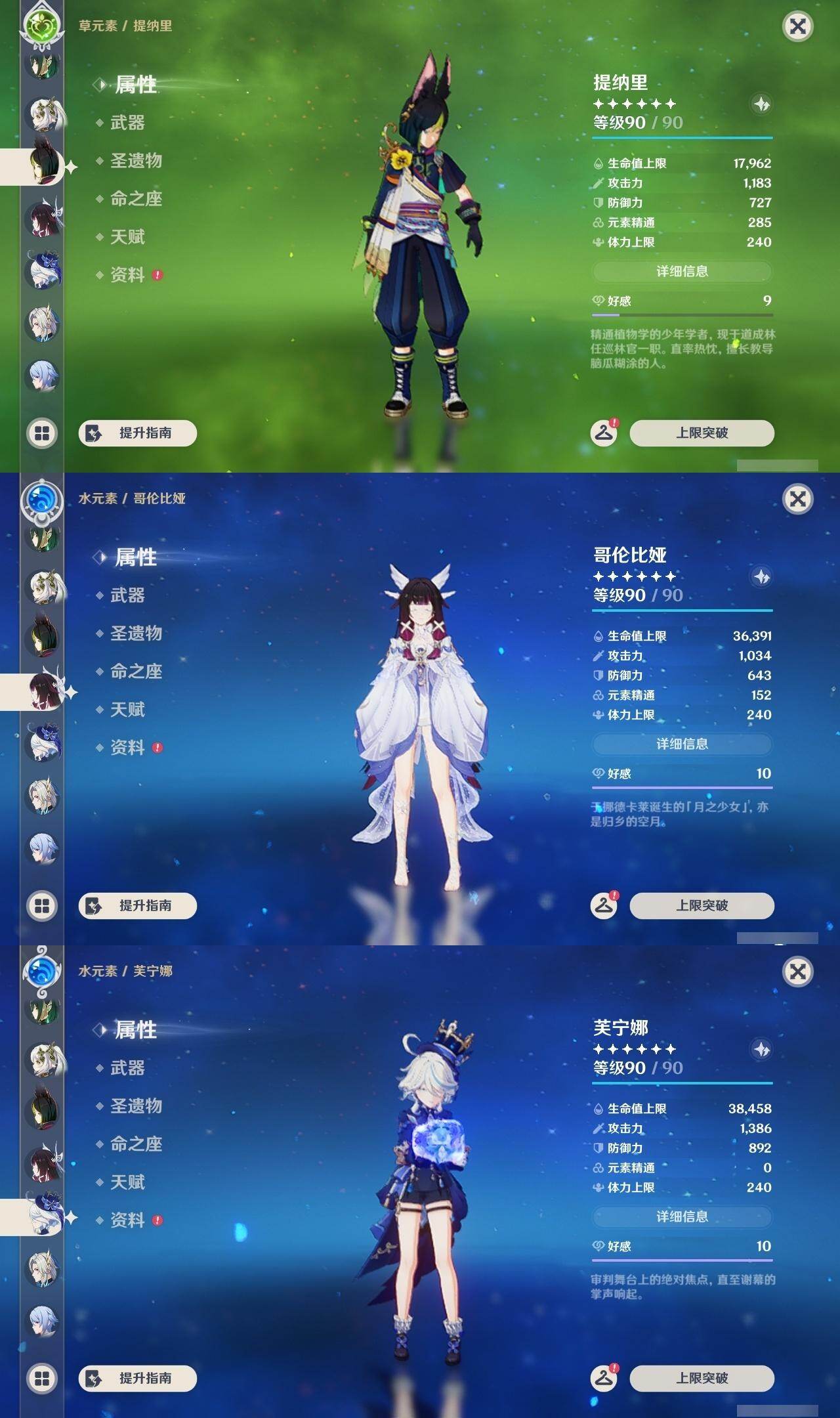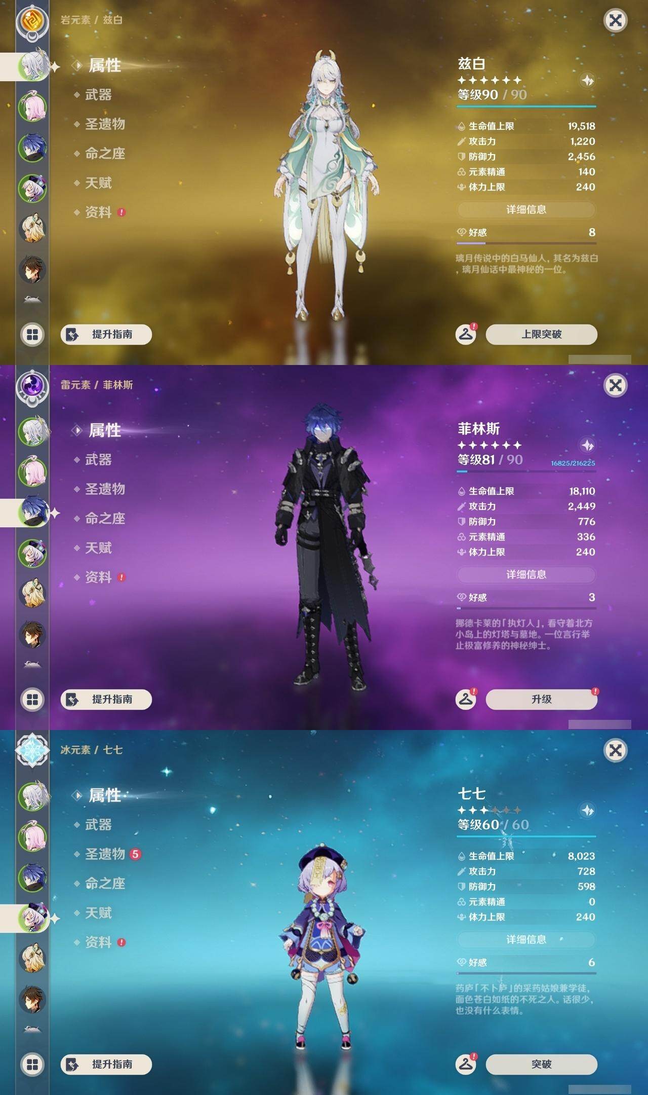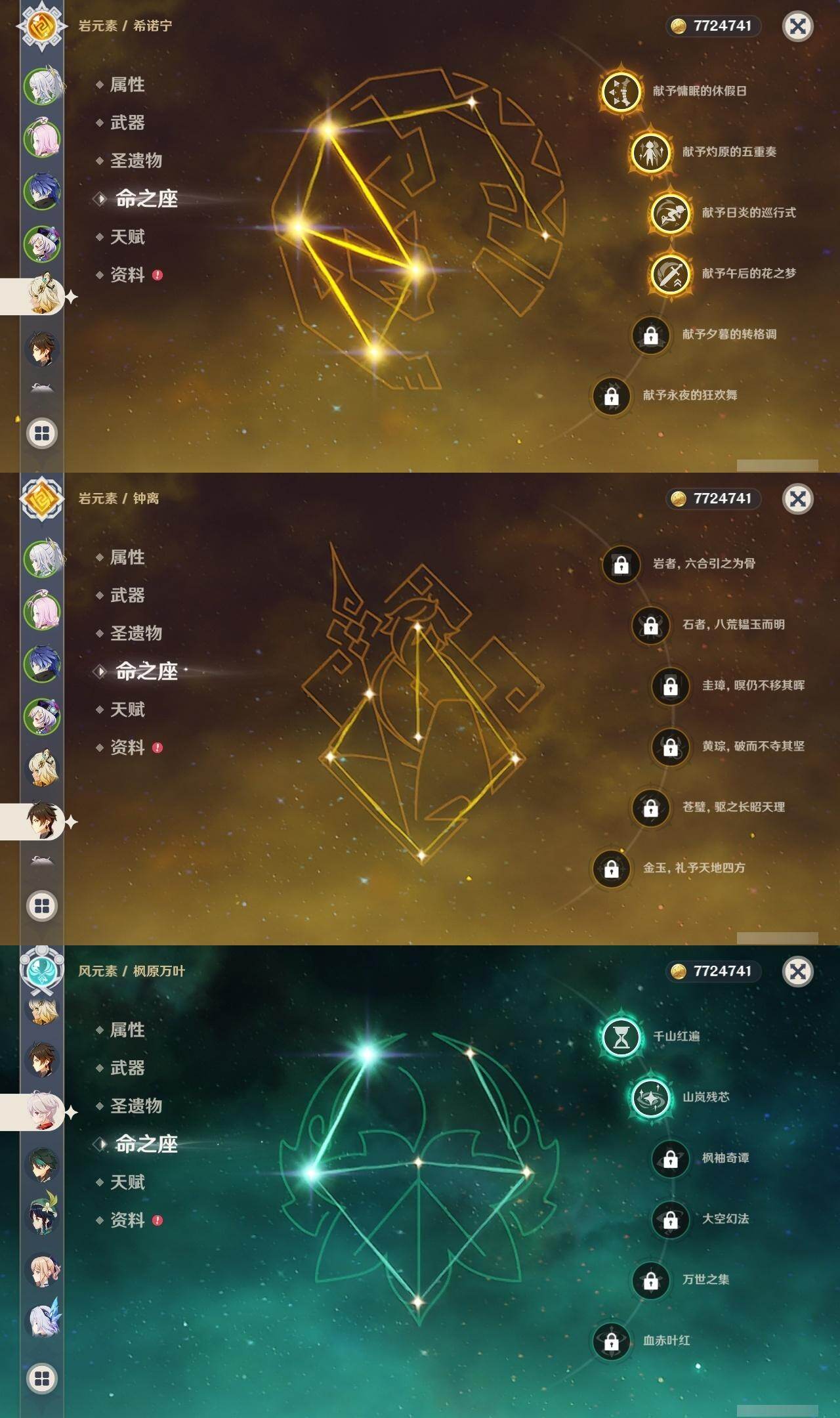 满命阿蕾奇诺,3命芙宁娜,1命那维莱特,1命迪希雅,0命流浪者,0命纳西妲,2命提纳里,满命夜兰,0命神里绫人,0命八重神子,1命申鹤,0命优菈,3命雷电将军,2命枫原万叶,0命钟离,1命甘雨,0命魈,0命宵宫,0命温迪,1命珊瑚宫心海,5命刻晴,满命七七,5命琴,满命莫娜,3命迪卢克,4命希诺宁,1命茜特菈莉,0命梦见月瑞希,0命丝柯克,0命伊涅芙,0命菲林斯,0命奈芙尔,0命哥伦比娅,0命兹白,精1赤月之形,精1静水流涌之辉,精1万世流涌大典,精1猎人之径,精1若水,精1波乱月白经津,精2薙草之稻光,精1雾切之回光,精1苍古自由之誓,精1护摩之杖,精1磐岩结绿,精3四风原典,精1和璞鸢,精1天空之脊,精1天空之翼,精1阿莫斯之弓,精1天空之刃,精1天空之卷,精2风鹰剑,精1天空之傲,精1岩峰巡歌,精1苍耀,精1支离轮光,精1帷间夜曲,精1朏魄含光