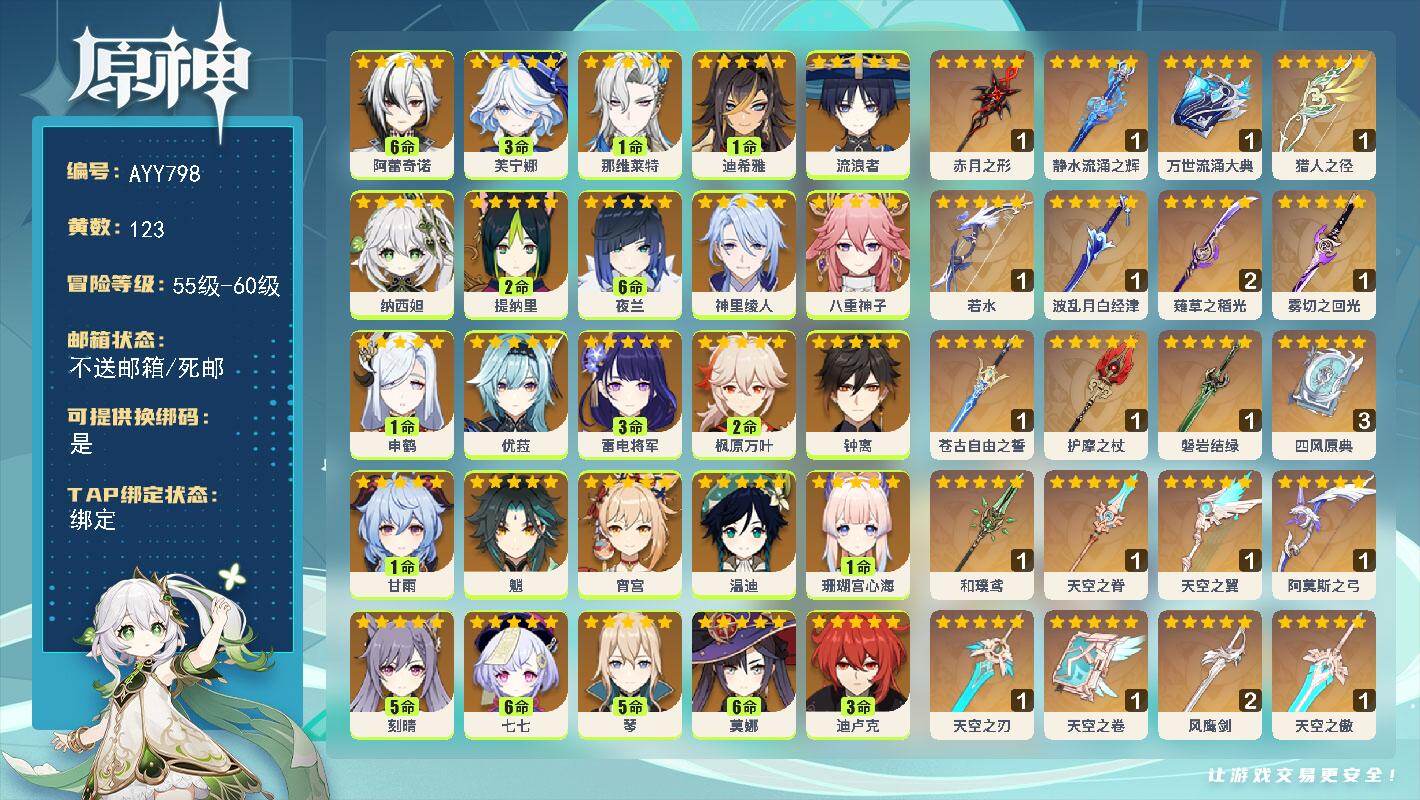[17826459]60级/123黄/女主/34个五星角色/28个五星武器 满命阿蕾奇诺,3命芙宁娜,1命那维莱特,1命迪希雅,0命流浪者,0命纳西妲,2命提纳里,满命夜兰,0命神里绫人,0命八重神子,1命申鹤,0命优菈,3命雷电将军,2命枫原万叶,0命钟离,1命甘雨,0命魈,0命宵宫,0命温迪,1命珊瑚宫心海,5命刻晴,满命七七,5命琴,满命莫娜,3命迪卢克,4命希诺宁,1命茜特菈莉,0命梦见月瑞希,0命丝柯克,0命伊涅芙,0命菲林斯,0命奈芙尔,0命哥伦比娅,0命兹白,精1赤月之形,精1静水流涌之辉,精1万世流涌大典,精1猎人之径,精1若水,精1波乱月白经津,精2薙草之稻光,精1雾切之回光,精1苍古自由之誓,精1护摩之杖,精1磐岩结绿,精3四风原典,精1和璞鸢,精1天空之脊,精1天空之翼,精1阿莫斯之弓,精1天空之刃,精1天空之卷,精2风鹰剑,精1天空之傲,精1岩峰巡歌,精1苍耀,精1支离轮光,精1帷间夜曲,精1朏魄含光
