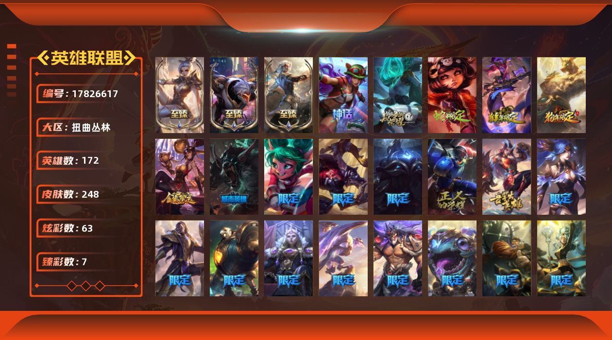 [17826617]未定级段位-172英雄-248皮肤-63炫彩-0终极-6神话-31限定-23传说-63史诗