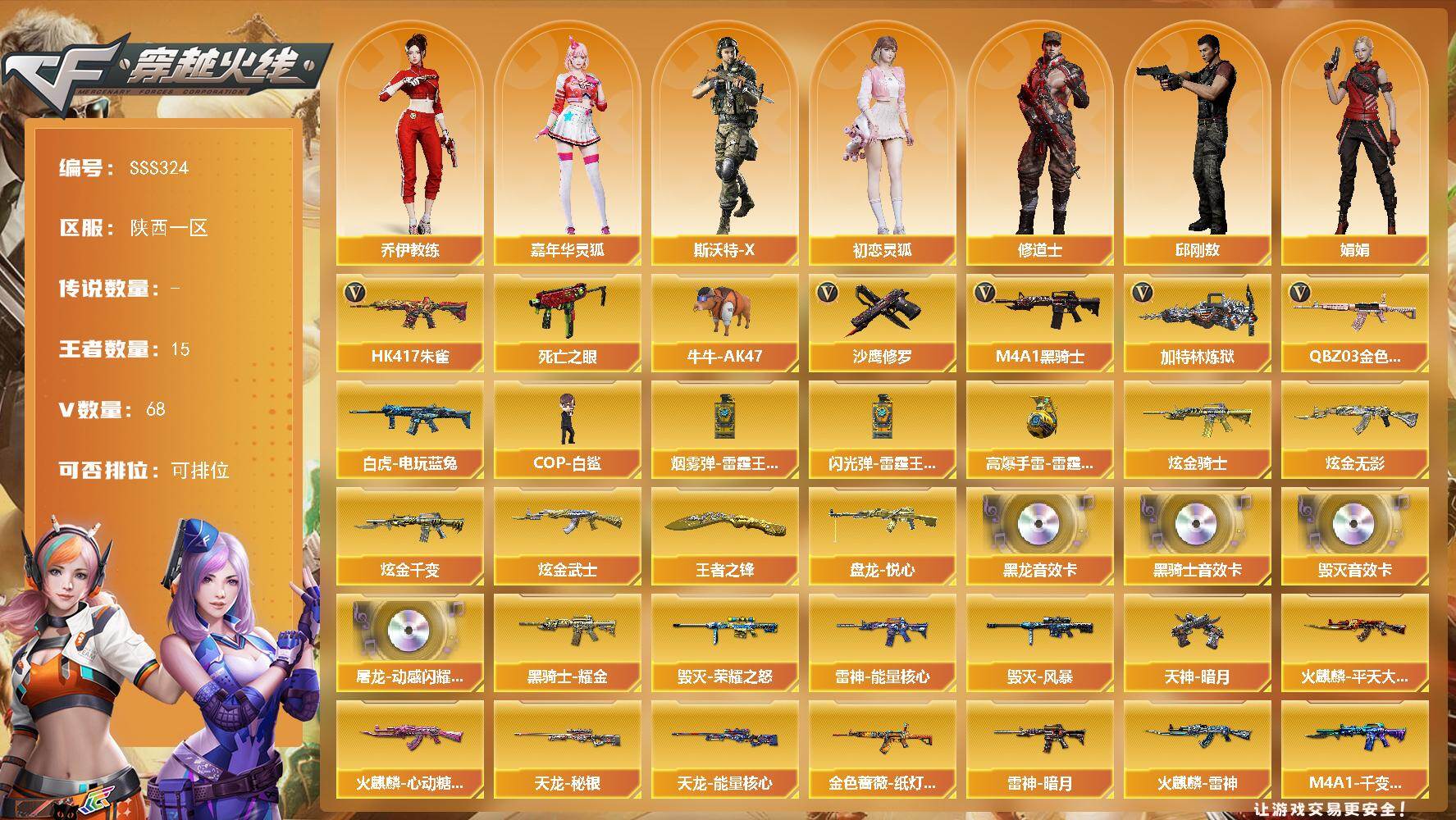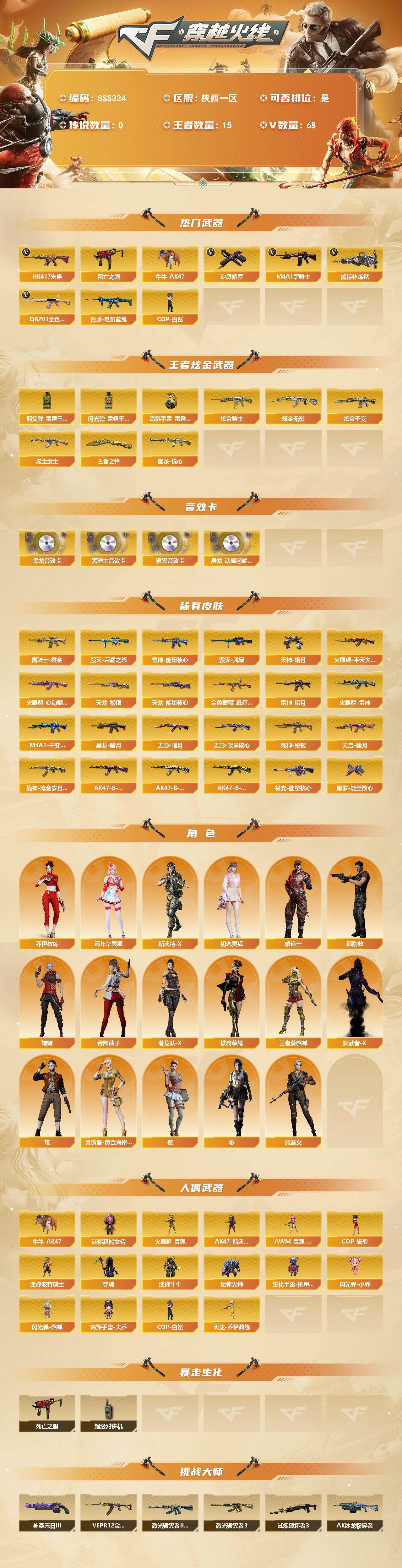 [17826644]陕西一区-76V-15王者武器数-4炫金武器数 【热门武器】:QBZ03-金色蔷薇,HK417-朱雀,死亡之眼,白虎-电玩蓝兔,牛牛-AK47,M4A1-黑骑士,加特林-炼狱*3,COP-白鲨,沙鹰-修罗*5 【王者炫金武器】:盘龙-悦心,王者之锋,高爆手雷-雷霆王者,烟雾弹-雷霆王者*2,闪光弹-雷霆王者*2,炫金骑士,炫金无影,炫金千变,炫金武士 【音效卡】:屠龙-动感闪耀 音效卡,M4A1-黑龙音效卡,M4A1-黑骑士音效卡,Barrett-毁灭音效卡 【皮肤】:金色蔷薇-纸灯龙皮肤,雷神-暗月,雷神-能量核心,火麒麟-雷神,火麒麟-平天大圣*2,火麒麟-心动糖果,毁灭-荣耀之怒,毁灭-风暴,M4A1-千变-孔明皮肤,黑龙-暗月,黑骑士耀金皮肤,无影-暗月*4,无影-能量核心,死神-秘银,天启-暗月*3,战神-流金岁月皮肤,AK47-B-常胜将军-曹操*2,AK47-B-常胜将军-刘备,AK47-B-常胜将军-孙权*2,天龙-秘银*2,天龙-能量核心,极光-能量核心,修罗-能量核心*3,天神-暗月*2 【角色】:零,樱,炫,王者-葵-貂蝉,乔伊教练,修道士,初恋灵狐,风暴女,嘉年华灵狐,娟娟,灵狐者-黄金海岸,潜龙队-X,邱刚敖,青霞仙子,斯沃特-X,铁骑荣耀,影武者-X 【人偶武器】:COP-白鲨,火麒麟-灵狐,天龙-乔伊教练,AWM-灵狐-15周年嘉年华,COP-旗袍,牛牛-AK47,迷你波特博士*4,夺魂*2,迷你牛牛*2,迷你火种*2,生化手雷-机甲核心,闪光弹-小乔,闪光弹-貂蝉,高爆手雷-大乔,AK47-斯沃特,迷你超能女侍 【暴走生化】:死亡之眼,超级对讲机 【挑战大师】:AK47-冰龙粉碎者,激光毁灭者III-白马银枪,VEPR-12-金魔,激光毁灭者III,试炼破坏者III,神圣爆裂者-末日III 【英雄级武器】:M4A1-千变,AK47-火麒麟*2,M4A1-黑龙,M4A1-雷神*2,M4A1-黑骑士,AK47-无影,M4A1-死神*2,AK47-黑武士,AK12-天启,M4A1-龙血,HK417-朱雀,无影-神兵利器,QBZ03-金色蔷薇,王者之魄-觉醒版,AK-47-猩红传说,黑骑士-海王*2,AK47-B-常胜将军*2,王者白虎-觉醒版,王者风势-觉醒版,白虎-电玩蓝兔,AK47-B-身先士卒,AK47-B-战士*2,AWM-天龙,
