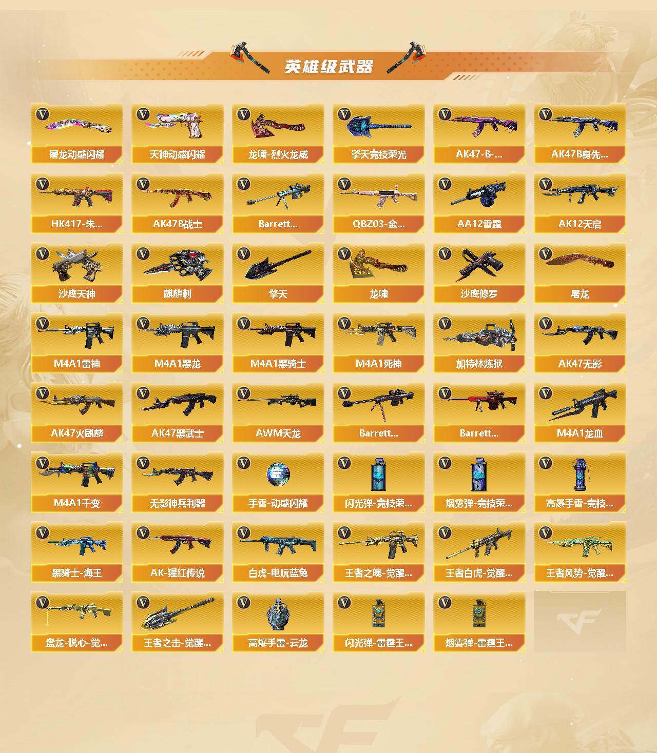 【英雄级武器】:M4A1-千变,AK47-火麒麟*2,M4A1-黑龙,M4A1-雷神*2,M4A1-黑骑士,AK47-无影,M4A1-死神*2,AK47-黑武士,AK12-天启,M4A1-龙血,HK417-朱雀,无影-神兵利器,QBZ03-金色蔷薇,王者之魄-觉醒版,AK-47-猩红传说,黑骑士-海王*2,AK47-B-常胜将军*2,王者白虎-觉醒版,王者风势-觉醒版,白虎-电玩蓝兔,AK47-B-身先士卒,AK47-B-战士*2,AWM-天龙,