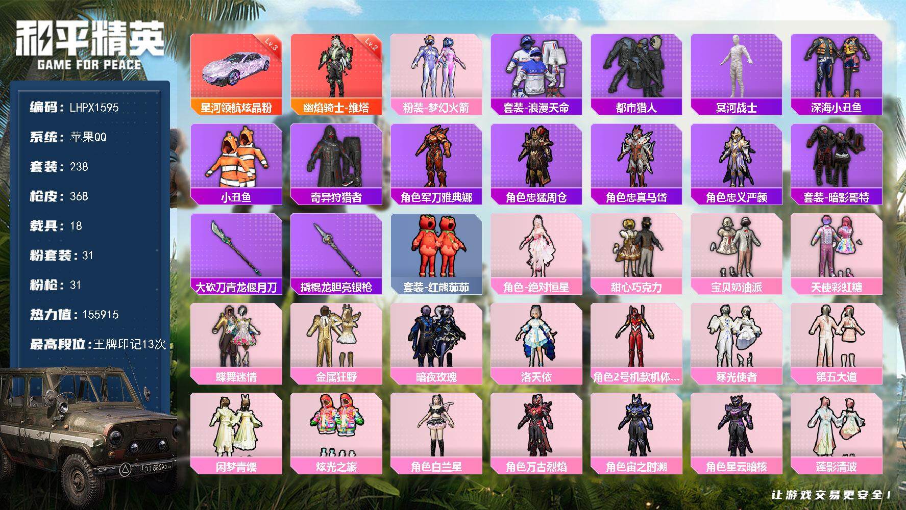 - [12248406]【特价急出/详情看图】:苹果 手Q-1神装-2特效枪-1.6w热力值-4王牌印记-39套装-66枪皮【红色神装等级】:最终圣卫者-帕修斯(二级)【热门品类】:套装-浪漫天命,套装-都市猎人,套装-胖达团团,套装-暗影哥特【粉色枪皮等级】:Mk14-甜梦熊击(五级),DP-28-豹影疾电(五级)