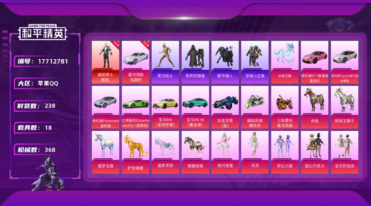 [17712781]9级aug星梦奇缘 9级m4超新星 苹果 手Q-1神装-31粉装-31特效枪-18载具-18粉色飞行器-155915热力值-13王牌印记-238套装-368枪皮 【红色载具】:星河领航(炫晶粉)(三级) 【红色神装等级】:幽焰骑士-维塔(二级) 【红色角色神装】:幽焰骑士-维塔 【热门品类】:粉装-梦幻火箭,套装-浪漫天命,套装-都市猎人,套装-冥河战士,套装-深海小丑鱼,套装-小丑鱼,套装-奇异狩猎者,角色-军刀雅典娜,角色-忠猛周仓,角色-忠真马岱,角色-忠义严颜,套装-暗影哥特,大砍刀-青龙偃月刀,撬棍-龙胆亮银枪,套装-红熊茄茄 【粉色套装】:角色-绝对恒星,粉装-甜心巧克力,粉装-宝贝奶油派,粉装-天使彩虹糖,粉装-蝶舞迷情,粉装-梦幻火箭,粉装-金属狂野,粉装-暗夜玫瑰,角色-洛天依,角色-2号机款机体服,粉装-寒光使者,粉装-第五大道,粉装-闲梦青缨,粉装-炫光之旅,角色-白兰星,角色-万古烈焰,角色-宙之时溯,角色-星云暗核,粉装-莲影清波,角色-圣堂之誓,角色-小蓝,角色-美雪,角色-千金淑猫,角色-月影灵韵,角色-樱桃泡泡,角色-狂魅哈莉,角色-罗征,角色-荧海星豚,角色-奇迹舞步 美雪,角色-花灵,角色-霁蓝缠春 【粉色枪皮等级】:AKM-梦之光华(七级),AKM-绿萝繁花(五级),AKM-幽焰骑士(一级),SCAR-L-锦绣绵绵(五级),SCAR-L-魔童闹海 哪吒(六级),M416-超新星(九级),M416-灵猫魔法师(一级),GROZA-巴啦啦小魔仙(二级),GROZA-镜光银凌(五级),AUG-星梦奇缘(九级),AUG-许七安(一级),AKS-74U-信仰神谕(三级),P90-沙丘之主(三级),P90-魔童闹海 敖丙(一级),Kar98K-圣光天使(二级),Kar98K-巳巳如意(五级),M24-莲影清波(三级),Mk14-盛世惊鸿(三级),AMR-鸢尾晶梦(五级),M417-第五大道(一级),SVD-月影灵韵(五级),M249-绝对恒星(二级),DP-28-豹影疾电(五级),MG3-洛神天依(一级),MG-36-沧焰双生(五级),M338-回旋牧梦使(三级),平底锅-仲夏莫吉托(三级),燃烧瓶-薄荷可可(七级),破片手榴弹-美味星星糖(七级) 【粉色载具】:星河领航(炫晶粉),兰博基尼Aventador SVJ(翡翠绿),宝马M4(