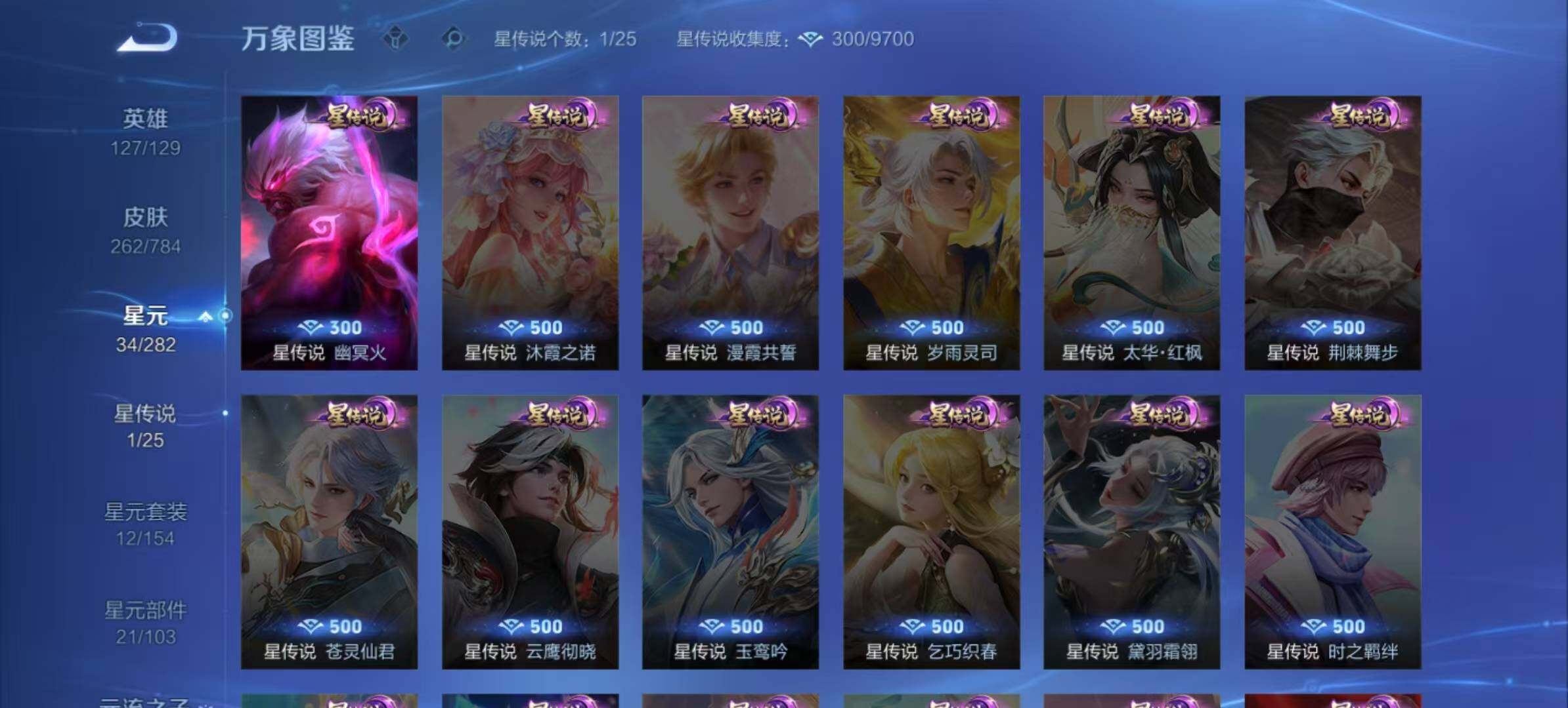 裴擒虎李小龙,上官婉儿梁祝,诸葛亮时雨天司,伽罗天狼溯光者,兰陵王影龙天霄,西施至美·乘鲤谣,甄姬至美·化雀舞,桑启鸣野蒿