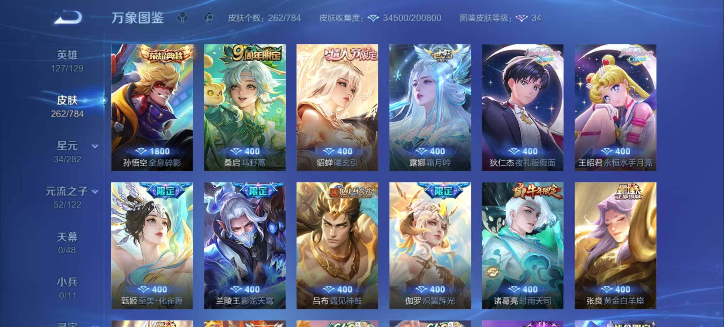 【限定皮肤】:大乔绒语心约,姜子牙天穹之誓,杨戬破阵退雄兵,狄仁杰阴阳师,赵云皇家上将,孙尚香蔷薇恋人,吕布遇见神鼓,元歌无心,甄姬至美化雀舞,狄仁杰魔术师,狄仁杰万华元夜,达摩星际陆战队,项羽海滩派对,老夫子醍醐杖,程咬金演武夺筹,兰陵王影龙天霄,兰陵王金庭之子,李元芳匿光侦查者,李元芳云中旅人,钟馗驱傩正仪,鬼谷子原初探秘者,鬼谷子五谷丰年,诸葛亮时雨天司,沈梦溪大漠名商,明世隐疑决卦,裴擒虎李小龙,裴擒虎擒涛扼浪,米莱狄胡桃异想国,云中君纤云弄巧,伽罗天狼溯光者,伽罗炽翼辉光,上官婉儿梁祝,嫦娥拒霜思,西施玲珑珍味,西施至美乘鲤谣,鲁班大师探海日志,桑启海盐诗旅,戈娅驭风魔法,艾琳流音漫舞,司空震地狱燃心,阿古朵江河有灵,张良古海寻踪,王昭君永恒水手月亮,狄仁杰夜礼服假面,蒙犽百解令,高渐离燃音魔法,妲己灵卜魔法,鬼谷子天穹祈灯,伽罗琥珀纪元,姬小满妄想食味,安琪拉乘龙聚宝船,貂蝉曦玄引,百里玄策超元猎域,沈梦溪龙舞盛年,刘邦剑破天穹,程咬金群星魔术团,刘备异域游侠,芈月浮光幕影,周瑜熔金海岸