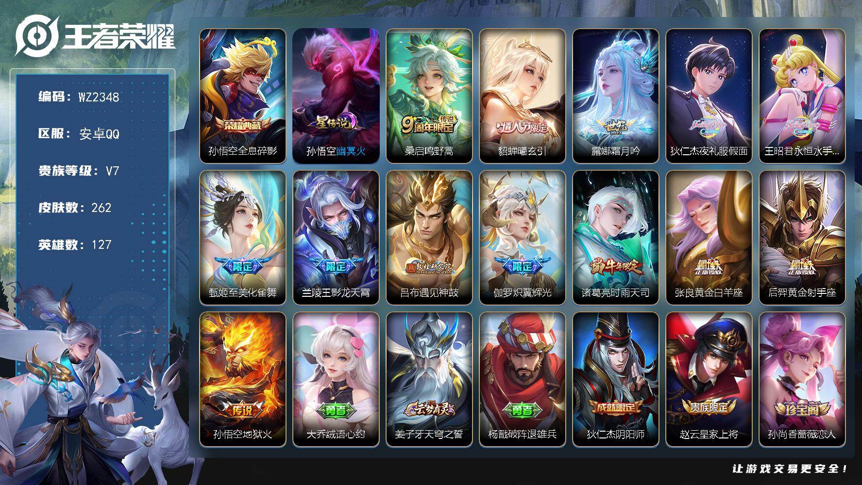 - [15999047]【特价出售/店主推荐】安卓Q-V9-至尊星耀V段位-129英雄-375皮肤-4典藏皮肤-1典藏英雄-21传说-102史诗 【英雄全皮】:刘禅全皮,刘邦全皮,孙权全皮,李信全皮,猪八戒全皮,空空儿全皮,影全皮 【荣耀典藏】:武则天英雄,孙悟空全息碎影,夏侯惇无限飓风号,孙尚香杀手不太冷,貂蝉幻阙歌 【传说皮肤】:后羿神树通天,澜愿照九州拓,桑启鸣野蒿,马可波罗妄想实况,曜山海苍雷引,李信山海炽霜斩,吕布怒海麟威,李白诗剑行,马超无双飞将,诸葛亮时雨天司,镜炽阳神光,虞姬启明星使,李信一念神魔,干将莫邪久胜战神,达摩黄金狮子座,百里玄策白虎志,花木兰冠军飞将,后羿黄金射手座,李白凤求凰,孙悟空地狱火,武则天海洋之心 【限定皮肤】:白起狰,姜子牙天穹之誓,狄仁杰阴阳师,虞姬凯尔特女王,赵云皇家上将,嬴政优雅恋人,嬴政白昼王子,鲁班七号狮舞东方,庄周高山流水,高渐离死亡摇滚,阿轲迷踪丽影,孙膑天狼运算者,扁鹊炼金王,芈月重明,芈月幻夜卜梦,吕布猎兽之王,周瑜赤莲之焰,元歌云间偶戏,元歌无心,夏侯惇朔风刀,甄姬游园惊梦,甄姬落雪兰心,曹操烛龙,典韦穷奇,马可波罗暗影游猎,马可波罗山海玄木吟,马可波罗妄想实况,狄仁杰魔术师,狄仁杰万华元夜,达摩星际陆战队,达摩沙漠行僧,项羽海滩派对,老夫子醍醐杖,程咬金演武夺筹,露娜一生所爱,刘邦夺宝奇兵,韩信飞衡,兰陵王驯魔猎人,兰陵王金庭之子,花木兰瑞麟志,花木兰默契交锋,亚瑟潮玩骑士王,孙悟空大圣娶亲,牛魔御旌,后羿圣弓游侠,李元芳云中旅人,虞姬启明星使,钟馗神迹守卫,钟馗驱傩正仪,杨玉环遇见飞天,女娲朔望之晖,干将莫邪冰霜恋舞曲,干将莫邪真爱魔法,雅典娜单词大作战,雅典娜黎明之约,蔡文姬繁星吟游,太乙真人饕餮,鬼谷子原初探秘者,鬼谷子五谷丰年,诸葛亮时雨天司,黄忠火炮绅士,铠青龙志,苏烈千军破阵,百里玄策白虎志,百里玄策原初追逐者,百里守约朱雀志,弈星混沌棋,梦奇顽趣,明世隐疑决卦,裴擒虎李小龙,裴擒虎擒涛扼浪,狂铁御狮,米莱狄御霄,米莱狄胡桃异想国,云中君纤云弄巧,李信山海炽霜斩,伽罗天狼溯光者,盾山御銮,猪八戒西部大镖客,猪八戒猪悟能,上官婉儿梁祝,上官婉儿天狼绘梦者,嫦娥拒霜思,嫦娥暖冬兔眠,曜山海苍雷引,西施玲珑珍味,蒙犽狂想玩偶喵,鲁班大师探海日志,桑启海盐诗旅,暃星界游侠,戈娅驭风魔法,艾琳女武神,艾琳流音漫舞,司空震地狱