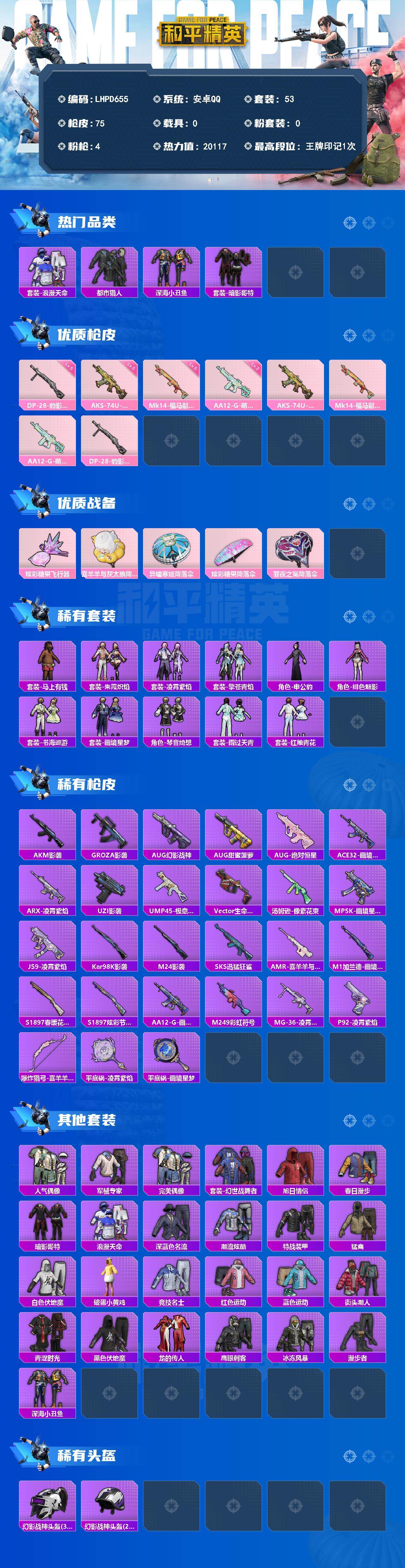 - PX_2107022-7【无二次】【因赛季更新游戏段付以上号为准!】安卓Q-6w热力值 13王牌印记 历史绝世王牌13星 163套装 199枪皮 【5稀有】 奇异狩猎者 浪漫天命 派对舞王 天网终结者 派对舞王(金靴子) 【9粉装】 羊梦糖心 万古烈焰 梦幻火箭 千金淑猫 创世救赎 宙之时溯 星云暗核 第五大道 鸾凤武仙 【6特效枪】 M416-电玩时刻 (5级) Kar98K-巳巳如意 (5级)