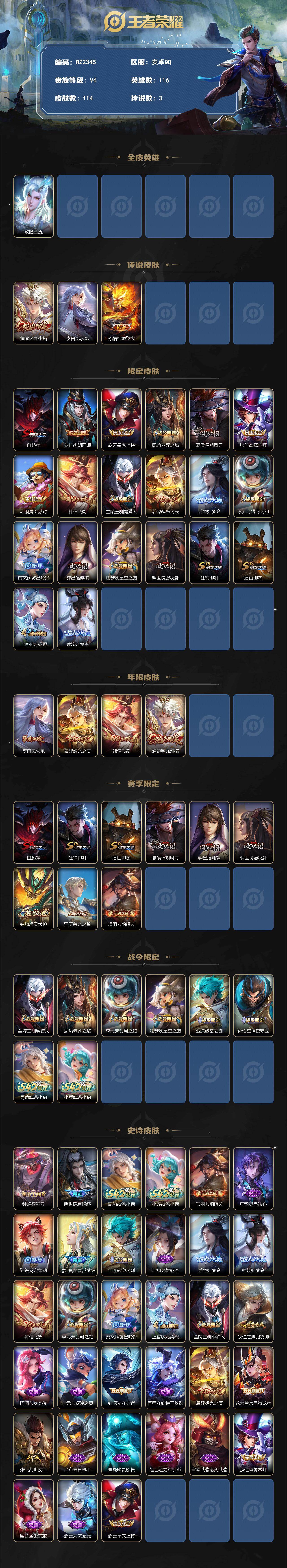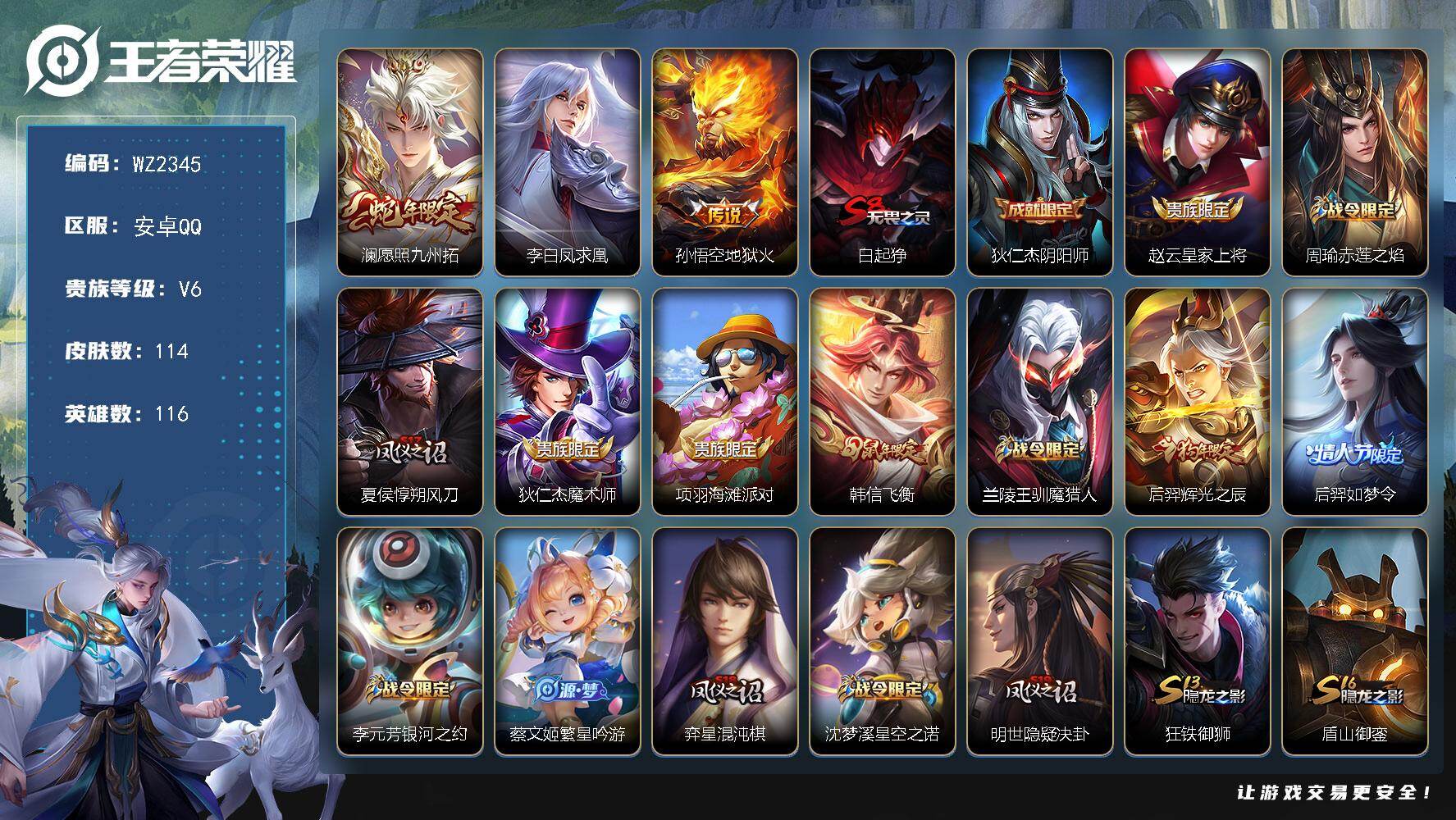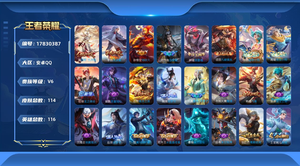 - [11883645]V8 1典藏 11传说 125英雄 259皮肤 可修改实名 优质装备:弑枪猎影(韩信典藏),云鹰飞将(小将军),零号·赤焰,李逍遥,淬星耀世,山海·苍雷引(电光曜子),澜逐花归海 传说皮:乘龙·铭钟鼎(赵云年限) 珍宝阁皮:妄想食味,优雅恋人,玩趣恶龙 限定皮:鸣野蒿,傲雪梅枪,时雨天司(水龙头),神威(电光马子),飞衡(韩信年限),高山流水,五谷丰年,梁祝,李小龙,逐梦之影,默契交锋-兰陵王,猪悟能,寅虎·赤拳(老虎年限) 史诗皮:灵蛊蚀心,星界战将,龙之律动,石田雨龙,破空之剑,百相守梦-黄忠,电玩小子(小书包),特工魅影,千年之狐,百解令(蒙犽),蒙恬荣光圣徽,冰冠公主,晚萤,百相守梦(刘备),暗夜猫娘,末日机甲-吕布,猫狗日记-大乔,乱世虎臣,修罗,女仆咖啡,水果甜心,绅士熊喵,天才门将,星夜王子,心灵骇客,功夫厨神,德古拉伯爵,鬼剑武藏,心灵战警,舞动绿茵,地狱岩魂,纤云弄巧,繁星吟游(呼啦呼啦),拒霜思,缤纷独角兽,乘风破浪,逐浪之夏,曙光守护者,热力回旋,金属风暴,原初追逐者,圣诞狂欢,圣诞恋歌,鹰眼统帅,魅力维加斯,黎明之约,赏金猎手,无心,未来纪元-赵云