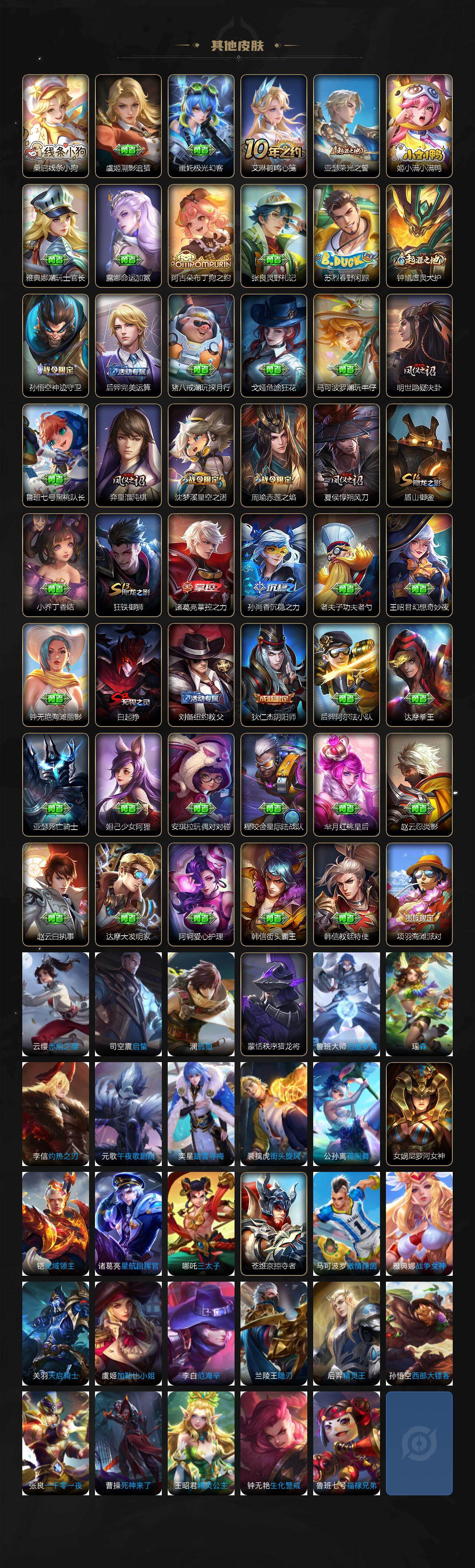 【其他皮肤】:桑启线条小狗,虞姬溯影追猎,蚩奼极光幻客,艾琳鹤鸣心笺,亚瑟荣光之誓,姬小满小满鸭,雅典娜潮玩士官长,露娜命运加冕,阿古朵布丁狗之约,张良灵野札记,苏烈春野闲踪,钟馗虚灵犬护,孙悟空神迹守卫,后羿完美运算,猪八戒潮玩探月行,戈娅危途狂花,马可波罗潮玩牛仔,明世隐疑决卦,鲁班七号黑桃队长,弈星混沌棋,沈梦溪星空之诺,周瑜赤莲之焰,夏侯惇朔风刀,盾山御銮,小乔丁香结,狂铁御狮,诸葛亮掌控之力,孙尚香沉稳之力,老夫子功夫老勺,王昭君幻想奇妙夜,钟无艳海滩丽影,白起狰,刘备纽约教父,狄仁杰阴阳师,后羿阿尔法小队,达摩拳王,亚瑟死亡骑士,妲己少女阿狸,安琪拉玩偶对对碰,程咬金星际陆战队,芈月红桃皇后,赵云忍炎影,赵云白执事,达摩大发明家,阿轲爱心护理,韩信街头霸王,韩信教廷特使,项羽海滩派对,云缨赤焰之缨,司空震启蛰,澜孤猎,蒙恬秩序猎龙将,鲁班大师归虚梦演,瑶森,李信灼热